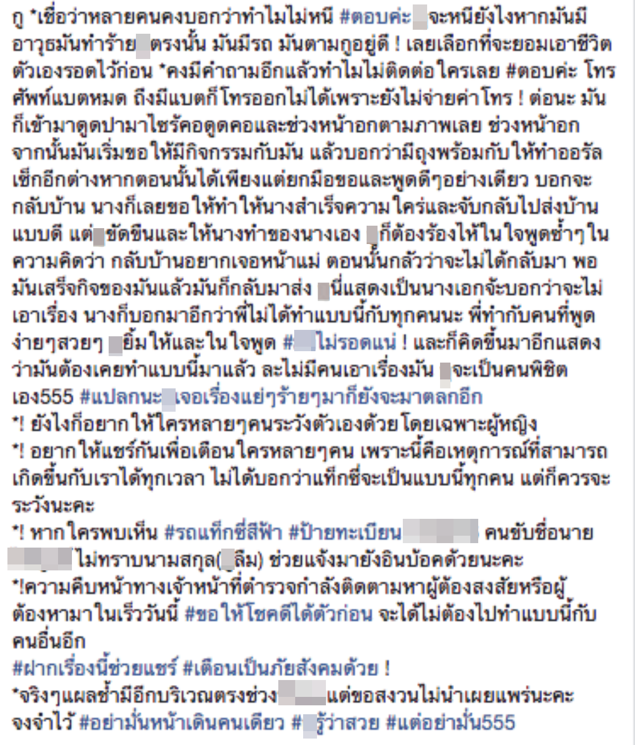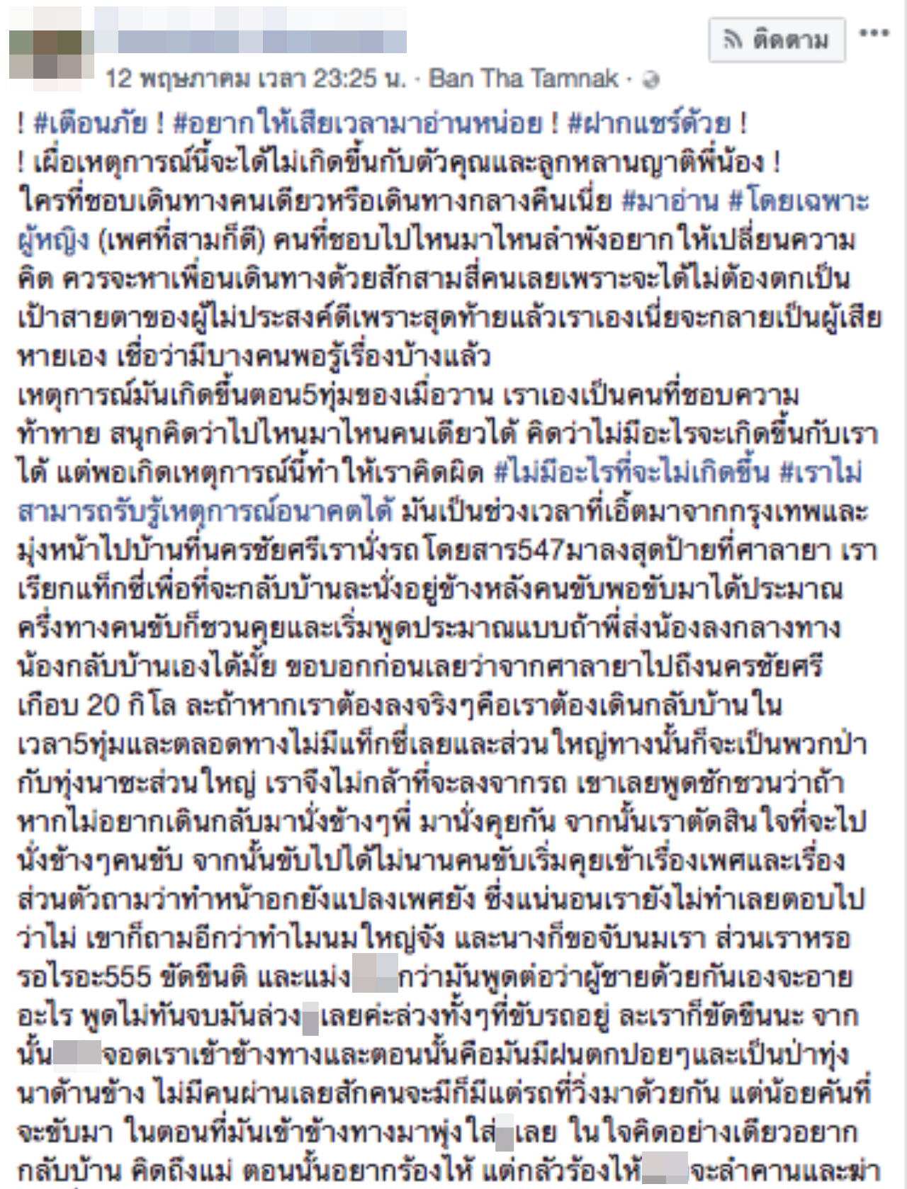 ผู้ใช้เฟซบุ๊กรายหนึ่งซึ่งเป็นสาวประเภทสอง ได้แชร์ประสบการณ์เตือนภัยคนที่ชอบเดินทางคนเดียวโดยเฉพาะเวลากลางคืน โดยเล่าว่า เวลาประมาณ 5 ทุ่ม ได้เรียกแท็กซี่จากศาลายาเพื่อกลับบ้านที่นครชัยศรี จ.นครปฐม แต่นั่งไปได้ประมาณครึ่งทาง คนขับได้พูดประมาณว่าหากให้ลงกลางทางจะกลับบ้านเองได้ไหม โดยสองข้างทางเป็นป่า ทุ่งนา และไม่มีรถแท็กซี่ผ่าน จากนั้นคนขับได้ชวนว่าหากไม่อยากเดินกลับบ้านให้เปลี่ยนมานั่งข้างคนขับแทน ด้วยความกลัวจึงยอมไปนั่งด้วย