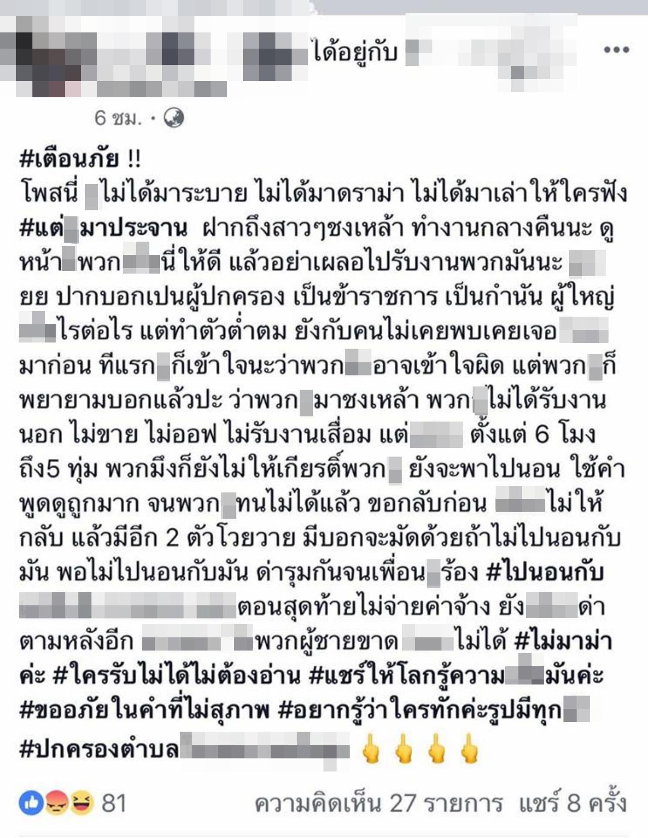 สาวชงเหล้าปล่อยโฮ เตือนภัยคณะดูงานกำนันผู้ใหญ่บ้านหื่นกาม พูดจาไม่ให้เกียรติ บังคับขายตัว สั่งจับมัดไปนอนด้วย ซ้ำไม่ยอมจ่ายค่าจ้าง...
