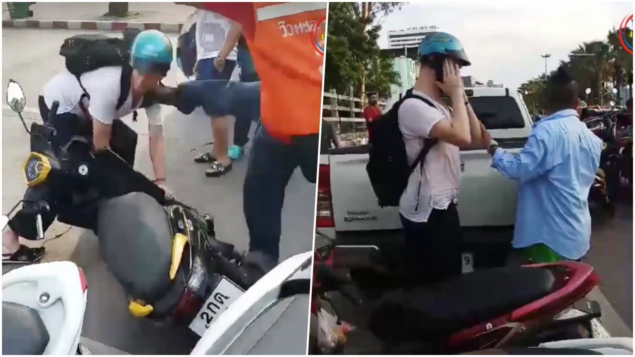 เสียชื่อเมืองท่องเที่ยว ชาวเน็ตวิจารณ์ คลิปวิน จยย.เตะหน้านักท่องเที่ยวกลางเมืองพัทยา หลังรถ จยย.ของฝรั่งโดนล็อกคอ จู่ๆ วิน จยย.เตะเข้าที่หน้าอย่างแรง