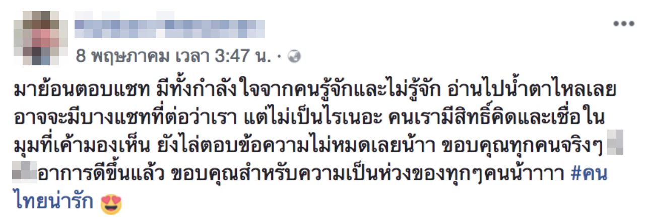 ทั้งนี้ ก่อนหน้าเจ้าตัวยังได้โพสต์ขอบคุณกำลังใจจากทุกคนที่ส่งให้ด้วย พร้อมเผยว่าอาการดีขึ้น ขอบคุณที่เป็นห่วง.