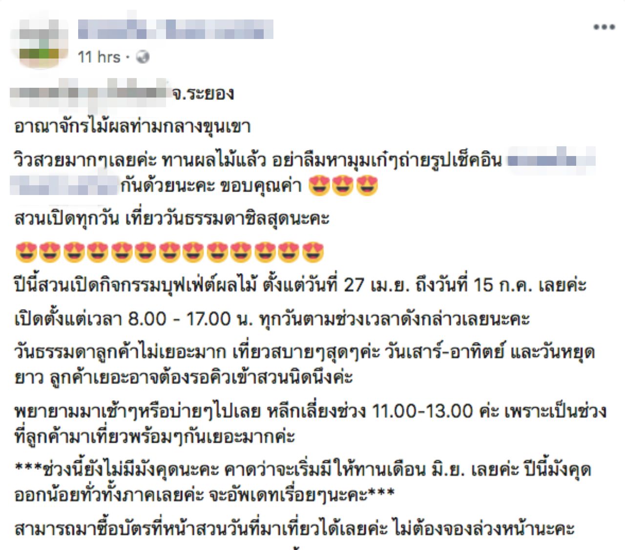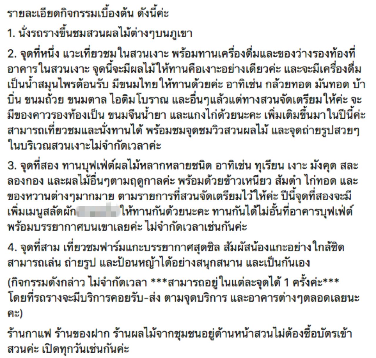 พร้อมกันนี้ ยังได้ต่อว่าเพิ่มเติมว่า ไม่มีการประกาศผ่านช่องทางใดๆ ของสวนเพื่อให้คนที่จะเดินทางมาทราบว่าไม่มีทุเรียนให้ทาน มาแล้วเสียเที่ยว อย่างไรก็ตาม ขณะนั้นมีการประกาศของสวนว่า ทุเรียนที่เตรียมไว้นั้นหมดแล้ว แต่ผลไม้อย่างอื่นยังมีอยู่