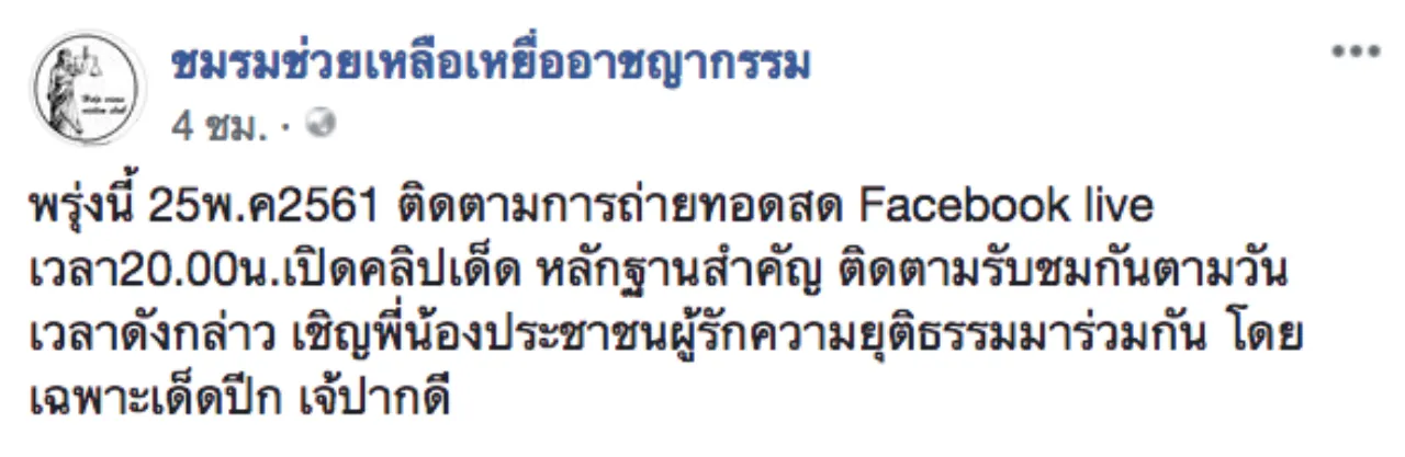 เมื่อวันที่ 25 พ.ค. นายอัจฉริยะ เรืองรัตนพงศ์ ประธานชมรมช่วยเหลือเหยื่ออาชญากรรม ได้โพสต์ข้อความผ่านแฟนเพจเฟซบุ๊กชมรม ระบุ 'พรุ่งนี้ 25 พ.ค 2561 ติดตามการถ่ายทอดสด Facebook live เวลา 20.00 น. เปิดคลิปเด็ด หลักฐานสำคัญ ติดตามรับชมกันตามวันเวลาดังกล่าว เชิญพี่น้องประชาชนผู้รักความยุติธรรมมาร่วมกัน โดยเฉพาะเด็ดปีก เจ๊ปากดี'