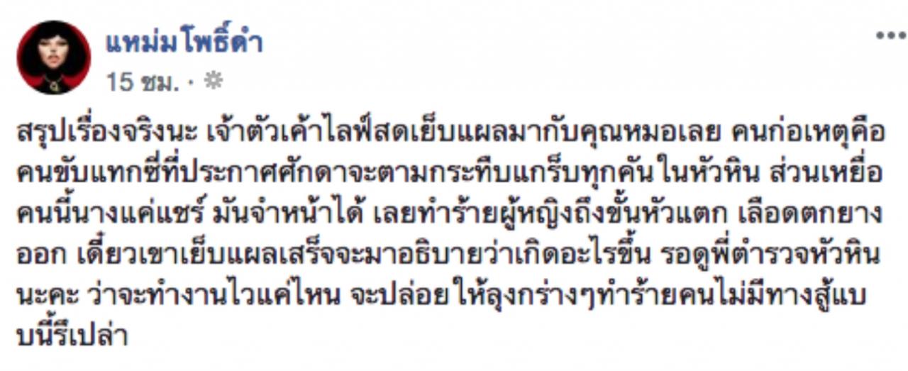 แฟนเพจ แหม่มโพธิ์ดำ ได้โพสต์ภาพสาวคนหนึ่งมีเลือดไหลออกจากปาก ระบุว่า หลายวันก่อนสาวคนดังกล่าวได้ไปคอมเมนต์และแชร์คลิปของโชเฟอร์แท็กซี่คนหนึ่งที่ประกาศว่าจะตามกระทืบแกร็บทุกคันในหัวหิน ซึ่งโชเฟอร์จำหน้าสาวคนนี้ได้ เมื่อสาวคนดังกล่าวเดินผ่านจึงถูกโชเฟอร์แท็กซี่เข้าทำร้ายก่อนขับรถหลบหนีไป ส่วนเพื่อนที่เหลือได้เข้ามาต่อย ทำให้ได้รับบาดเจ็บศีรษะแตก ปากเป็นแผล