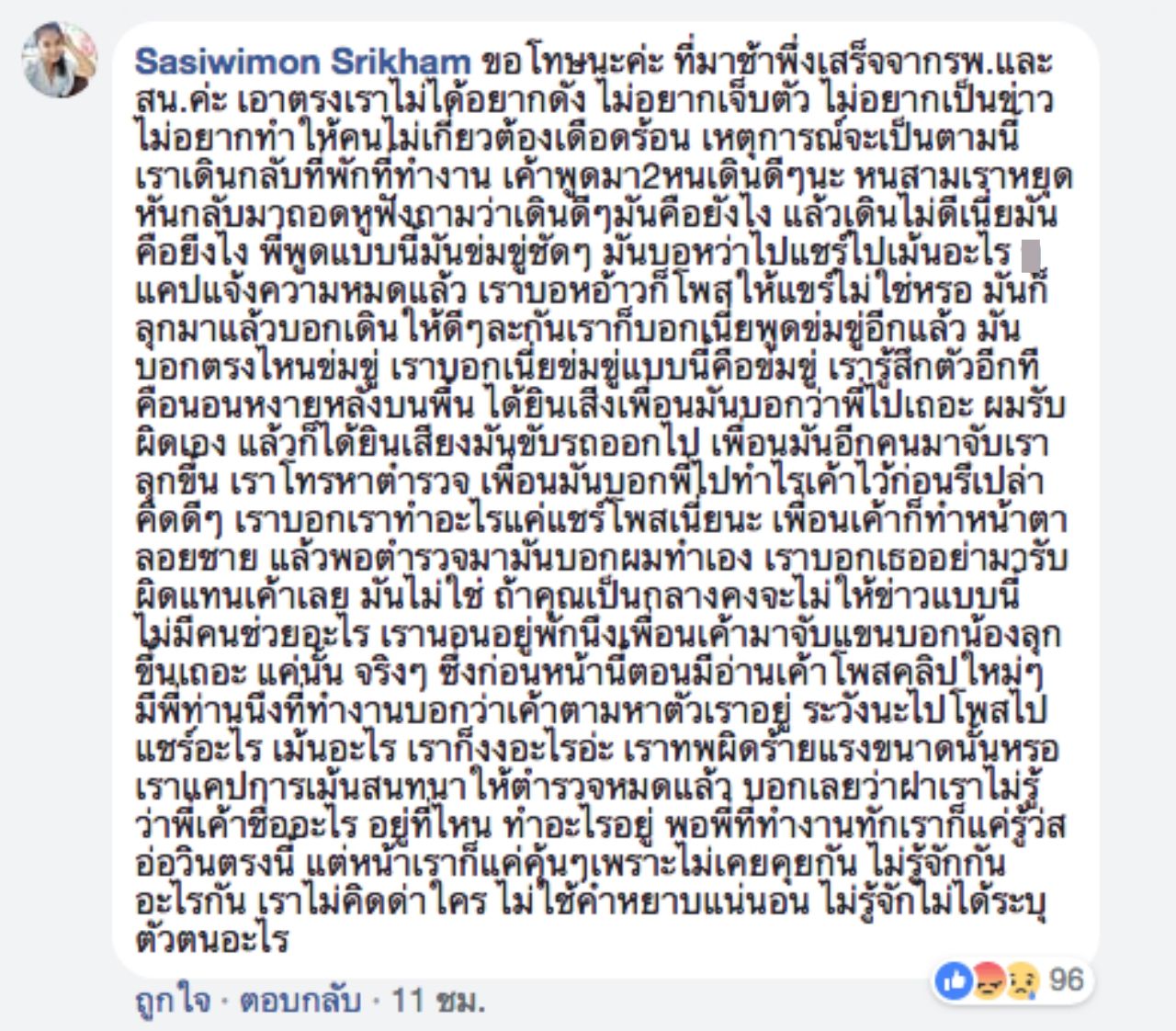 "เพื่อนมันอีกคนมาจับเราลุกขึ้น เราโทรหาตำรวจ เพื่อนมันบอกพี่ไปทำไรเขาไว้ก่อนหรือเปล่าคิดดีๆ เราบอกเราทำอะไรแค่แชร์โพสต์เนี่ยนะ เพื่อนเขาก็ทำหน้าตาลอยชาย แล้วพอตำรวจมามันบอกผมทำเอง เราบอกเธออย่ามารับผิดแทนเขาเลย มันไม่ใช่ ถ้าคุณเป็นกลางคงจะไม่ให้ข่าวแบบนี้ ไม่มีคนช่วยอะไร เรานอนอยู่พักนึงเพื่อนเขามาจับแขนบอกน้องลุกขึ้นเถอะ แค่นั้น จริงๆ