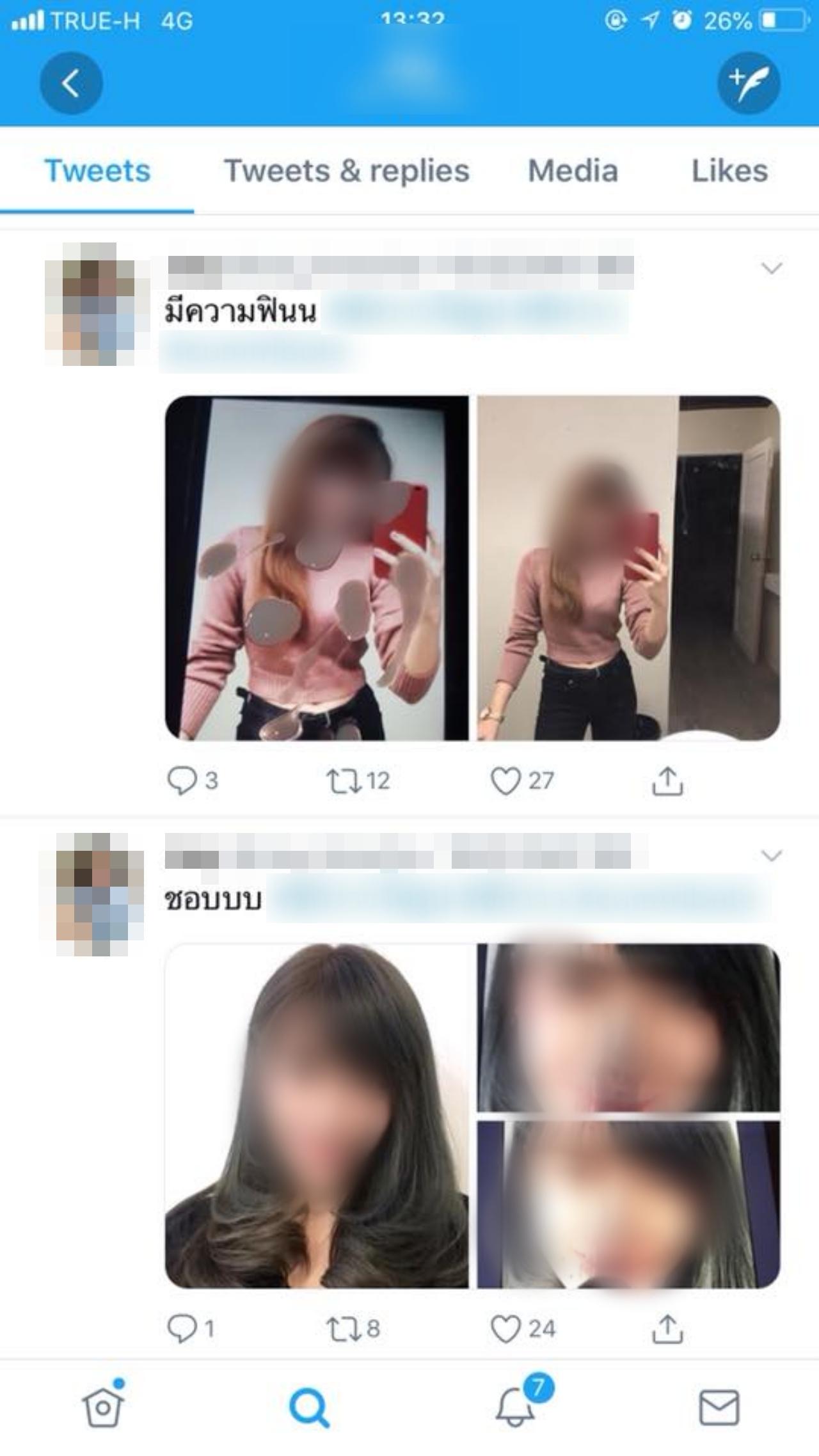 จากการตรวจสอบแอคเคาท์ทวิตเตอร์ดังกล่าวพบว่า มีภาพหญิงสาวหน้าตาดีหลายรายถูกผู้ใช้ทวิตเตอร์รายนี้นำภาพมาสำเร็จความใคร่โดยที่หญิงสาวไม่รู้ตัวและไม่ยินยอม สร้างความไม่พอใจให้กับชาวโซเชียลเป็นอย่างมาก โดยล่าสุดพบว่า แอคเคาท์ทวิตเตอร์ดังกล่าวได้ปิดตัวไปแล้ว.