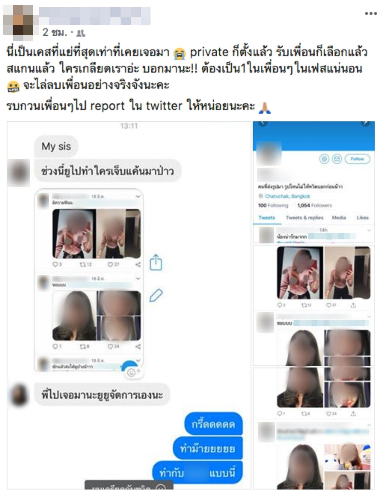 มีรายงานว่า ผู้ใช้เฟซบุ๊กสาวรายหนึ่งได้โพสต์ข้อความว่า ได้ตั้งค่าความเป็นส่วนตัวและเลือกรับเพื่อนในเฟซบุ๊กแล้ว แต่ก็ยังถูกทวิตเตอร์โรคจิตนำภาพในเฟซบุ๊กของตนเองไปสำเร็จความใคร่แล้วถ่ายภาพขณะมีน้ำกามเปื้อนอยู่บนภาพโชว์ในทวิตเตอร์ พร้อมกับข้อความสื่อในทางลามกอนาจาร