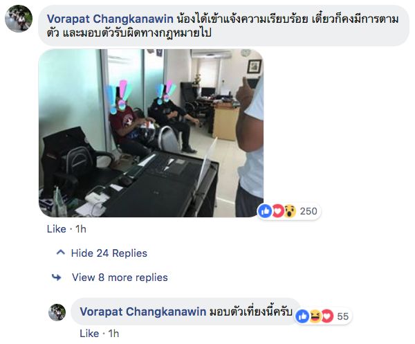 ขณะที่ผู้ใช้เฟซบุ๊ก Vorapat Changkanawin ที่เป็นรุ่นพี่ของผู้เสียหายก็ได้มีการโพสต์คลิปดังกล่าวเช่นกัน รวมทั้งมีการเปิดเผยผ่านคอมเมนต์ว่า น้องผู้เสียหายได้เข้าแจ้งความแล้ว และคู่กรณีติดต่อขอโทษพร้อมจะมอบตัวในวันนี้.