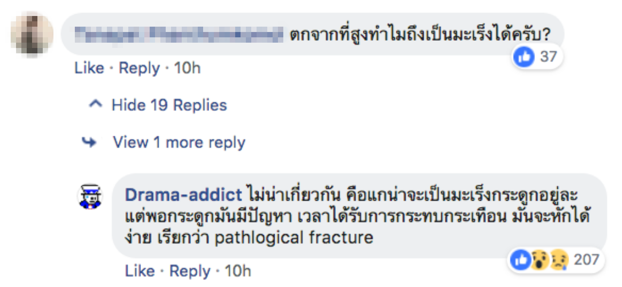 ทั้งนี้ ทางเพจอธิบายเพิ่มเติมไว้ในคอมเมนต์ว่า ไม่ใช่ว่าตกลงมาแล้วเป็นมะเร็ง แต่คนไข้น่าจะเป็นมะเร็งกระดูกอยู่ก่อนแล้วจึงทำให้กระดูกหักง่าย.
