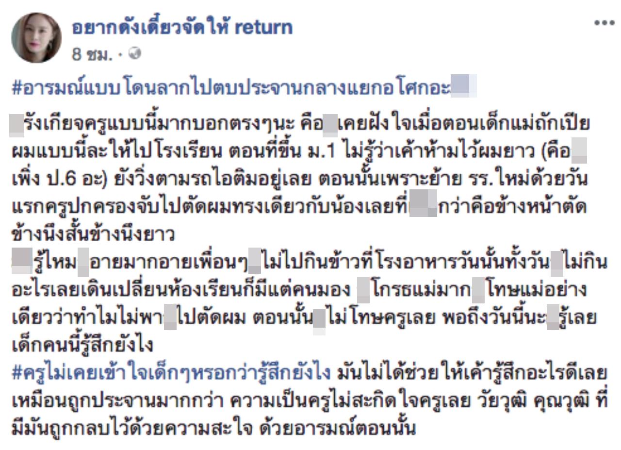 ผู้ใช้เฟซบุ๊กรายหนึ่ง ได้โพสต์ภาพลูกสาววัยประถมที่ถักเปียเรียบร้อย ถูกครูตัดผมจนสั้นประมาณกลางหู บริเวณท้ายทอยมีร่องรอยผมแหว่งเป็นหย่อมๆ ระบุข้อความว่า ถามหน่อยทรงนี้เรียกว่าทรงอะไรคะคุณครู พรุ่งนี้เจอกัน ซึ่งภายหลังทางผู้ปกครองได้อัพเดตเพิ่มเติมว่า ได้เข้าไปคุยกับครูคนดังกล่าว และคุณครูได้ขอโทษแล้ว
