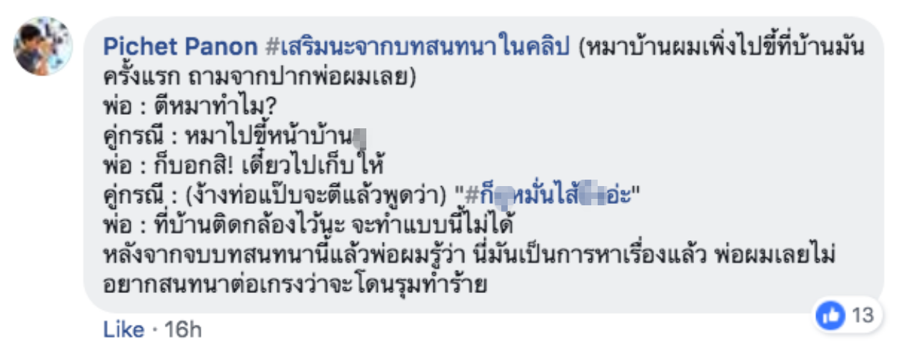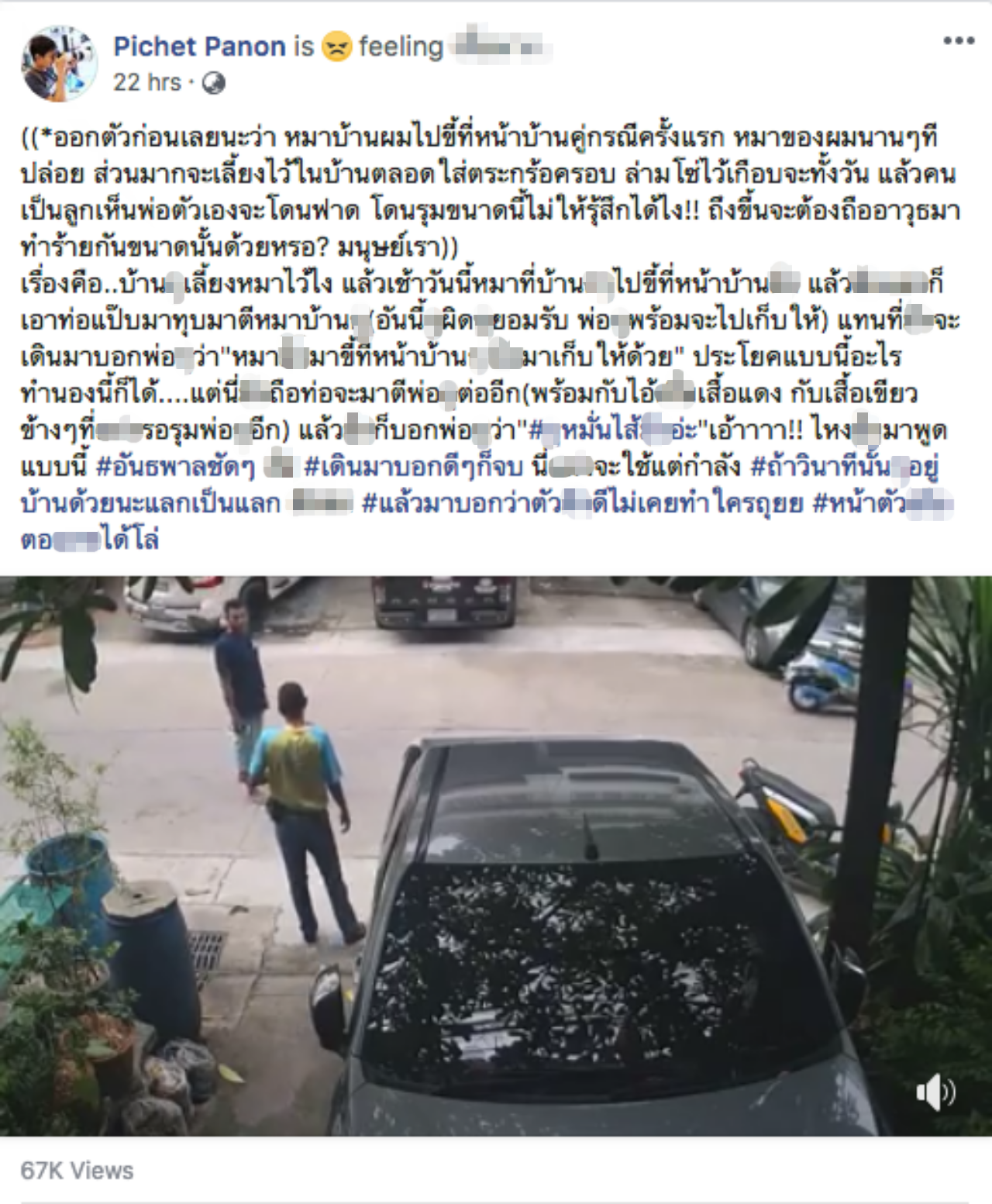 ผู้ใช้เฟซบุ๊ก Pichet Panon โพสต์คลิปกล้องวงจรปิดบริเวณหน้าบ้าน พร้อมบอกเล่าเหตุการณ์ที่คุณพ่อของผู้โพสต์หวิดจะมีเรื่องกับเพื่อนบ้านเพราะสุนัขที่เลี้ยงไว้ไปอุจจาระบริเวณหน้าบ้านของเพื่อนบ้าน โดยผู้โพสต์ระบุข้อความทำนองว่า
