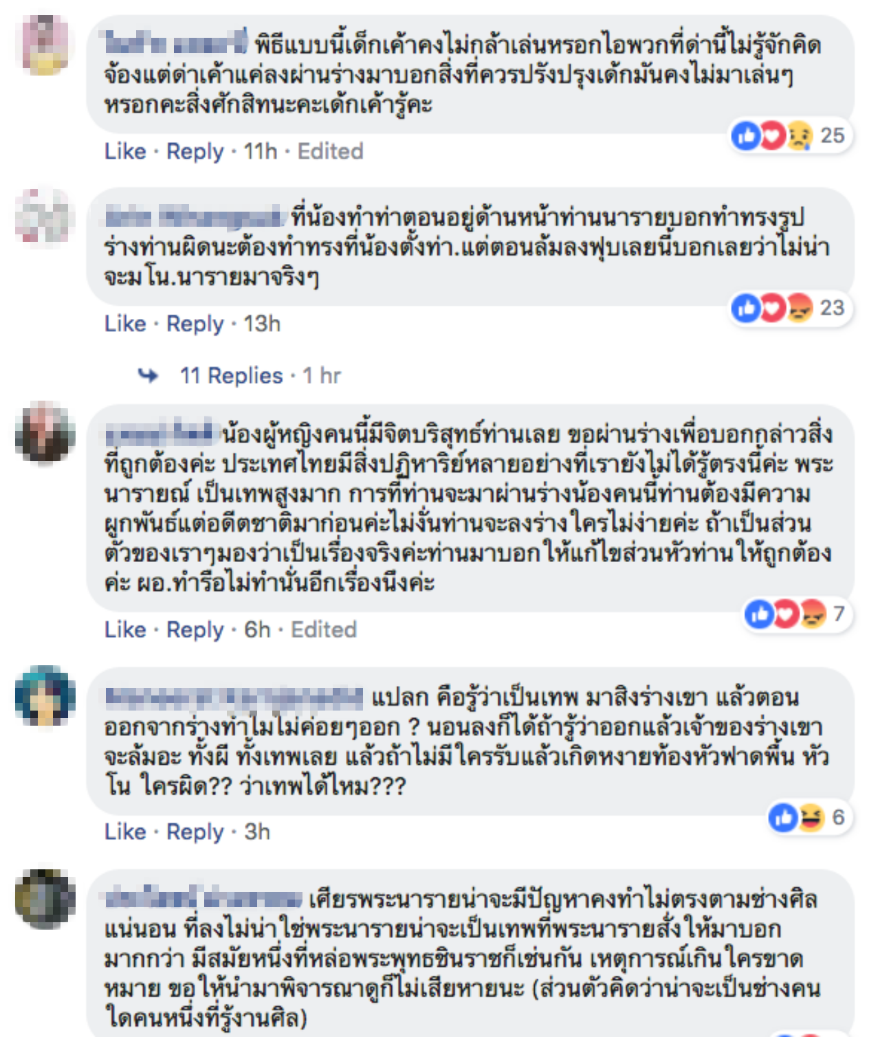 กระทั่งจู่ๆ นักเรียนหญิงคนนี้ก็กรีดร้องแล้วลุกขึ้นเดินไปนั่งยังฐานองค์พระนารายณ์ จากนั้นชี้ไปยังองค์พระนารายณ์ก่อนจะตะโกนถามด้วยสำเนียงใต้ว่า “ทำไมไม่ทำให้ดี บนหัว บนหัวเห็นไหม ทำให้มันดี เห็นไหมหะบนหัว” จากนั้นก็ยังย้ำให้ทำให้ดีจน ผอ. พูดขึ้นว่า “หล่อร่างไม่หล่อ หัวผิด ได้ๆ” และแค่เพียง ผอ.รับปาก นักเรียนหญิงก็คล้ายหมดแรงหมดสติทิ้งตัวลงทันที