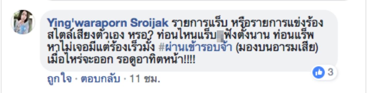 ผู้ใช้เฟซบุ๊กชื่อ Ying'waraporn Sroijak ได้แสดงความคิดเห็นผ่านเพจ Show Me The Money Thailand ว่า รายการแร็ป หรือรายการแข่งร้อง สไตล์เสียงตัวเอง เหรอ? ท่อนไหนแร็ป ฉันฟังตั้งนาน ท่อนแร็ป หาไม่เจอ มีแต่ร้องเร็วมั้ง #ผ่านเข้ารอบจ้า (มองบนอารมณ์เสีย) เมื่อไหร่จะออก รอดูอาทิตหน้า!!!!