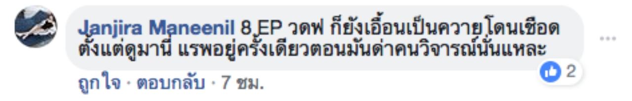 ผู้ใช้เฟซบุ๊กชื่อ Janjira Maneenil แสดงความคิดเห็นว่า 8 EP วดฟ. ก็ยังเอื้อนเป็นควายโดนเชือด ตั้งแต่ดูมานี่ แร็ปอยู่ครั้งเดียว ตอนเธอด่าคนวิจารณ์ นั่นแหละ.