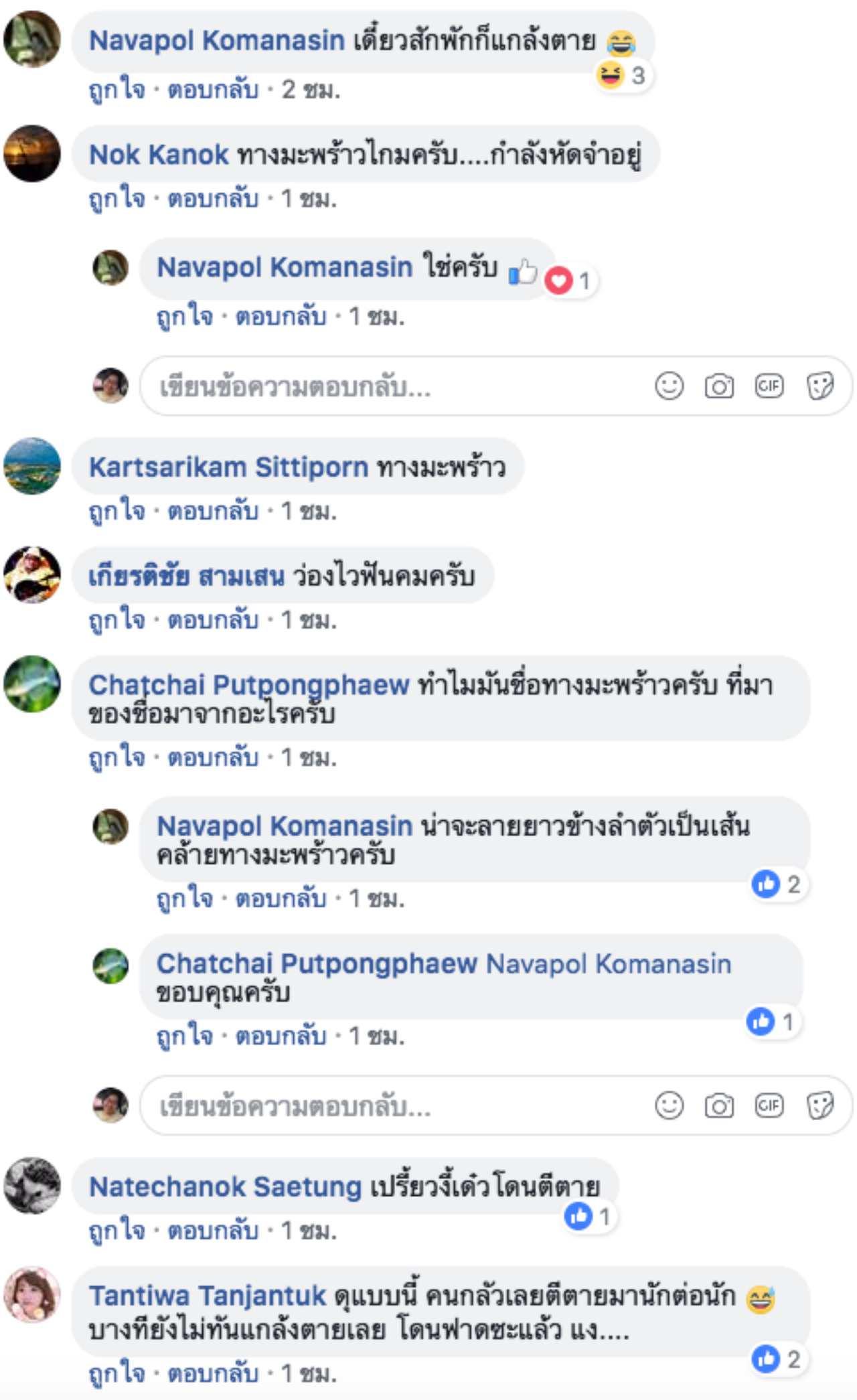 ทั้งนี้ สมาชิกในกลุ่มได้เข้ามาตอบว่า น่าจะเป็นงูทางมะพร้าว ซึ่งไม่มีพิษ และเพราะทำท่าทางดุแบบนี้คนกลัวเลยตีตายมานักต่อนัก บางทียังไม่ทันแกล้งตายเลย โดนฟาดซะแล้ว เป็นต้น