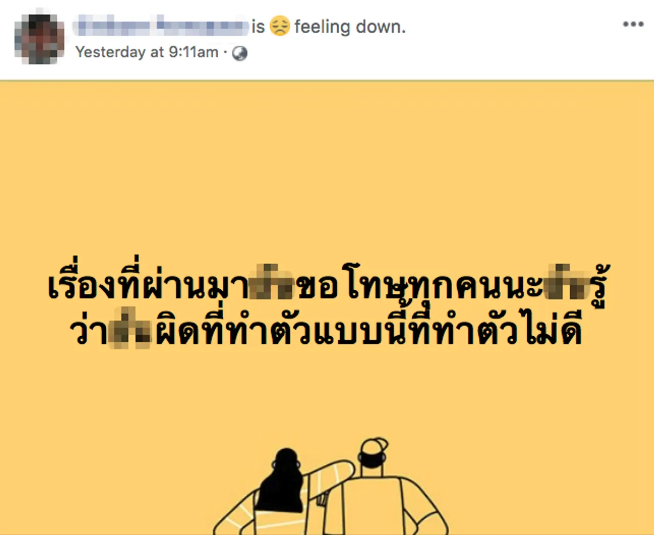 ด้านฝ่ายชายโพสต์เฟซบุ๊กเมื่อวันที่ 13 มิ.ย. 61 ว่า "เรื่องที่ผ่านมาขอโทษทุกคนนะ รู้ว่าผิดที่ทำตัวแบบนี้ ที่ทำตัวไม่ดี"