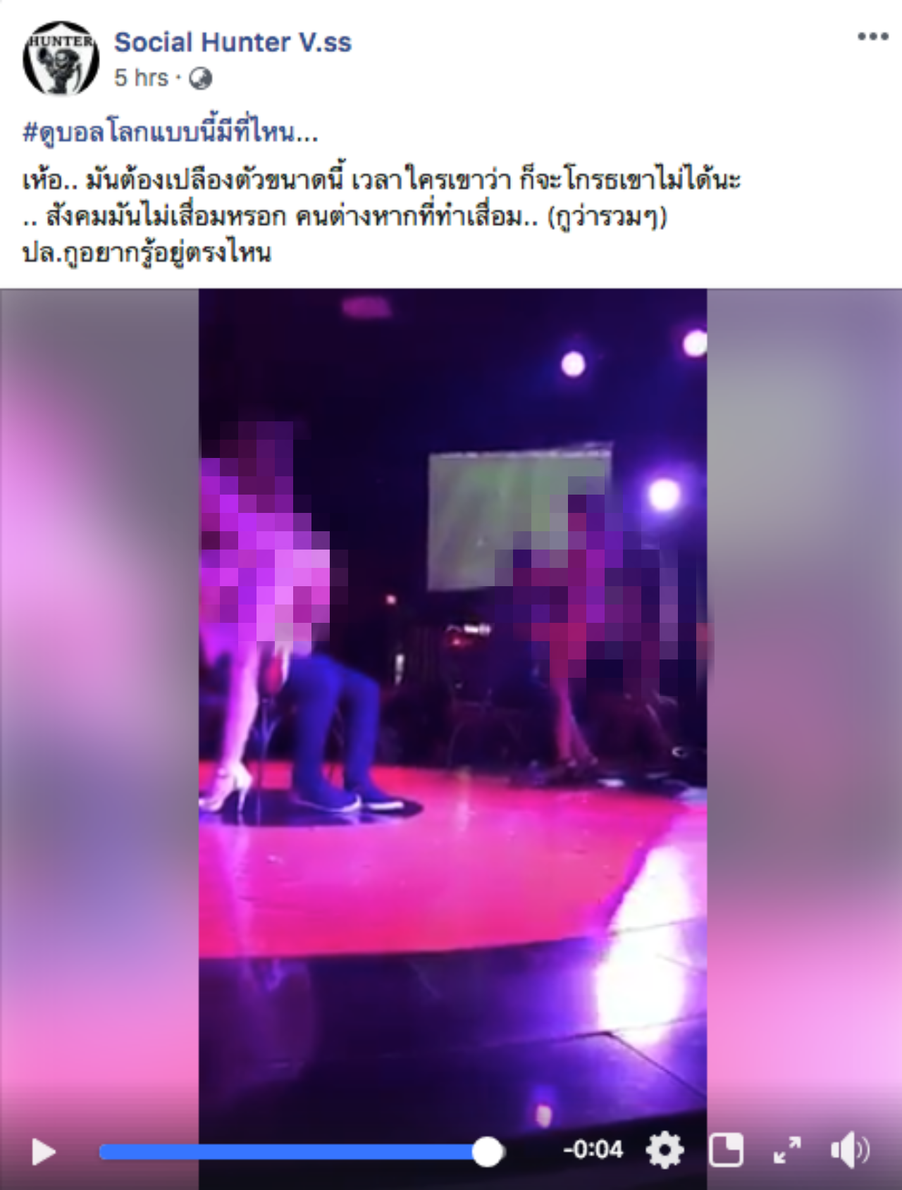 แฟนเพจเฟซบุ๊ก Social Hunter V.ss โพสต์คลิปพร้อมระบุข้อความว่า “#ดูบอลโลกแบบนี้มีที่ไหน... เห้อ..มันต้องเปลืองตัวขนาดนี้ เวลาใครเขาว่า ก็จะโกรธเขาไม่ได้นะ .. สังคมมันไม่เสื่อมหรอก คนต่างหากที่ทำเสื่อม.. (กูว่ารวมๆ)”