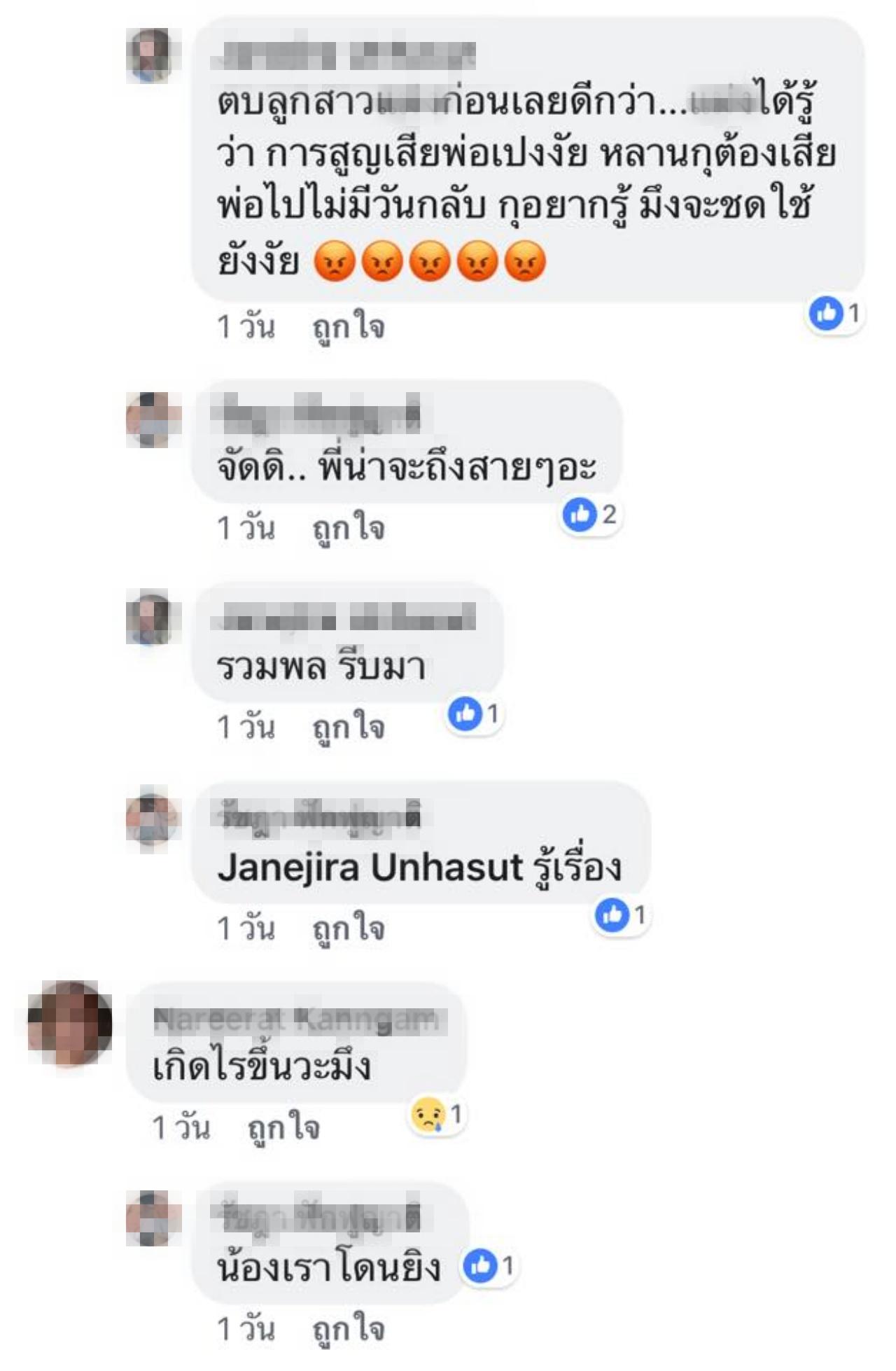 ต่อมา โลกโซเชียลได้แชร์ข้อความจากผู้ใช้เฟซบุ๊กรายหนึ่ง ที่อ้างว่าเป็นญาติของผู้ตาย โดยเป็นการพูดคุยกับเพื่อนว่า จะตามไปทำร้ายลูกสาวลุงที่เสียชีวิต จะได้รู้ว่าการสูญเสียลูกสาวเป็นอย่างไร หลังจากที่หลานของตัวเองก็สูญเสียพ่อไปเหมือนกัน ซึ่งก็มีเพื่อนๆ เข้ามาร่วมสนับสนุน