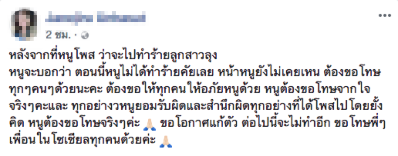 แต่ต่อมา ได้มีการลบโพสต์ดังกล่าวออก พร้อมโพสต์ข้อความขอโทษ โดยระบุว่า "หลังจากที่หนูโพสต์ว่าจะไปทำร้ายลูกสาวลุง หนูจะบอกว่า ตอนนี้หนูไม่ได้ทำร้ายใครเลย หน้าหนูยังไม่เคยเห็น ต้องขอโทษ ทุกๆ คนด้วยนะคะ ต้องขอให้ทุกคนให้อภัยหนูด้วย หนูต้องขอโทษจากใจจริงๆ ค่ะ และทุกอย่างหนูยอมรับผิด และสำนึกผิดทุกอย่างที่ได้โพสต์ไปโดยไม่ยั้งคิด หนูต้องขอโทษจริงๆ ค่ะ ขอโอกาสแก้ตัว ต่อไปนี้จะไม่ทำอีก ขอโทษพี่ๆ เพื่อนในโซเชียลทุกคนด้วยค่ะ".
