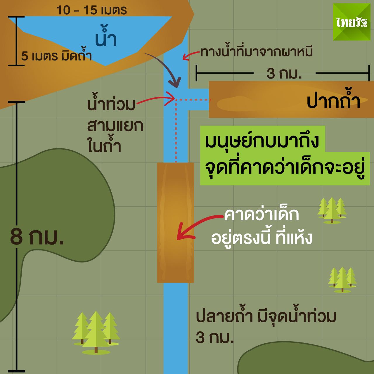 ขณะที่แฟนเพจเฟซบุ๊ก Thai NavySEAL ได้โพสต์ข้อความว่า “ชุดนักดำน้ำ ดำน้ำลงไปลึก 5 เมตร พบทางลอดเข้าถึงห้องโถงใหญ่หลังม่านน้ำ เดินสำรวจภายในบริเวณนั้นที่มีความลึก 7 กิโลเมตร พบร่องรอยเด็กๆ แต่ยังไม่พบตัว” ก่อนที่ต่อมาจะโพสต์และข้อความว่า “นักดำน้ำต้องดำน้ำลึก 5 เมตร เข้าสู่ห้องโถงใหญ่”