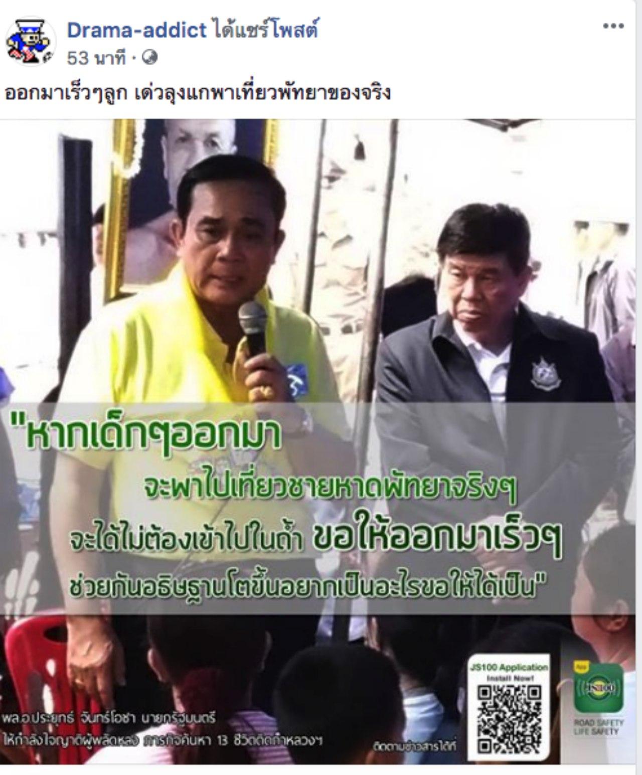 แฟนเพจเฟซบุ๊ก Drama-addict แชร์โพสต์ของ จส.100 ที่บอกว่า หากเด็กๆ ออกมาจะพาไปเที่ยวชายหาดพัทยาจริงๆ จะได้ไม่ต้องเข้าไปในถ้ำ ขอให้ออกมาเร็วๆ ช่วยกันอธิษฐานโตขึ้นอยากเป็นอะไรขอให้ได้เป็น ขอให้ออกมาเร็วๆ ช่วยกันอธิษฐาน พร้อมระบุว่า "ออกมาเร็วๆลูก เดี๋ยวลุงแกพาเที่ยวพัทยาของจริง"