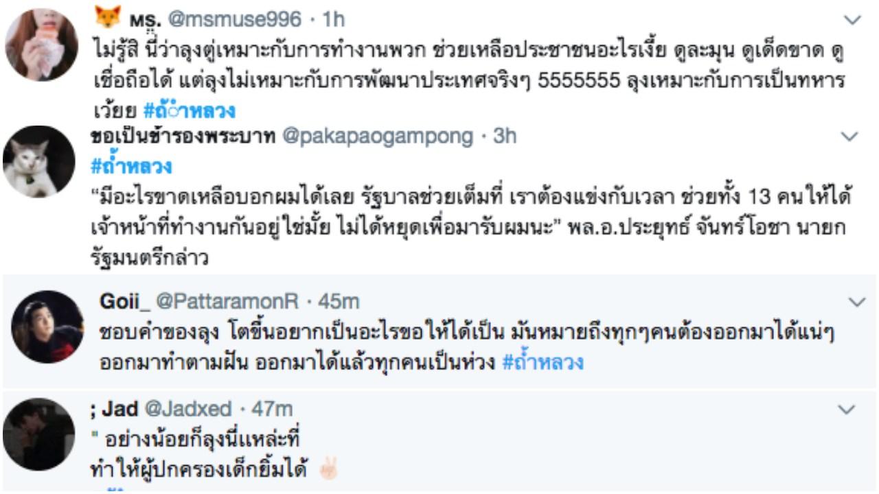 ผู้ใช้ทวิตเตอร์ @msmuse996 : ไม่รู้สิ นี่ว่าลุงตู่เหมาะกับการทำงานพวก ช่วยเหลือประชาชนอะไรเงี้ย ดูละมุน ดูเด็ดขาด ดูเชื่อถือได้ แต่ลุงไม่เหมาะกับการพัฒนาประเทศจริงๆ 5555555 ลุงเหมาะกับการเป็นทหารเว้ยย