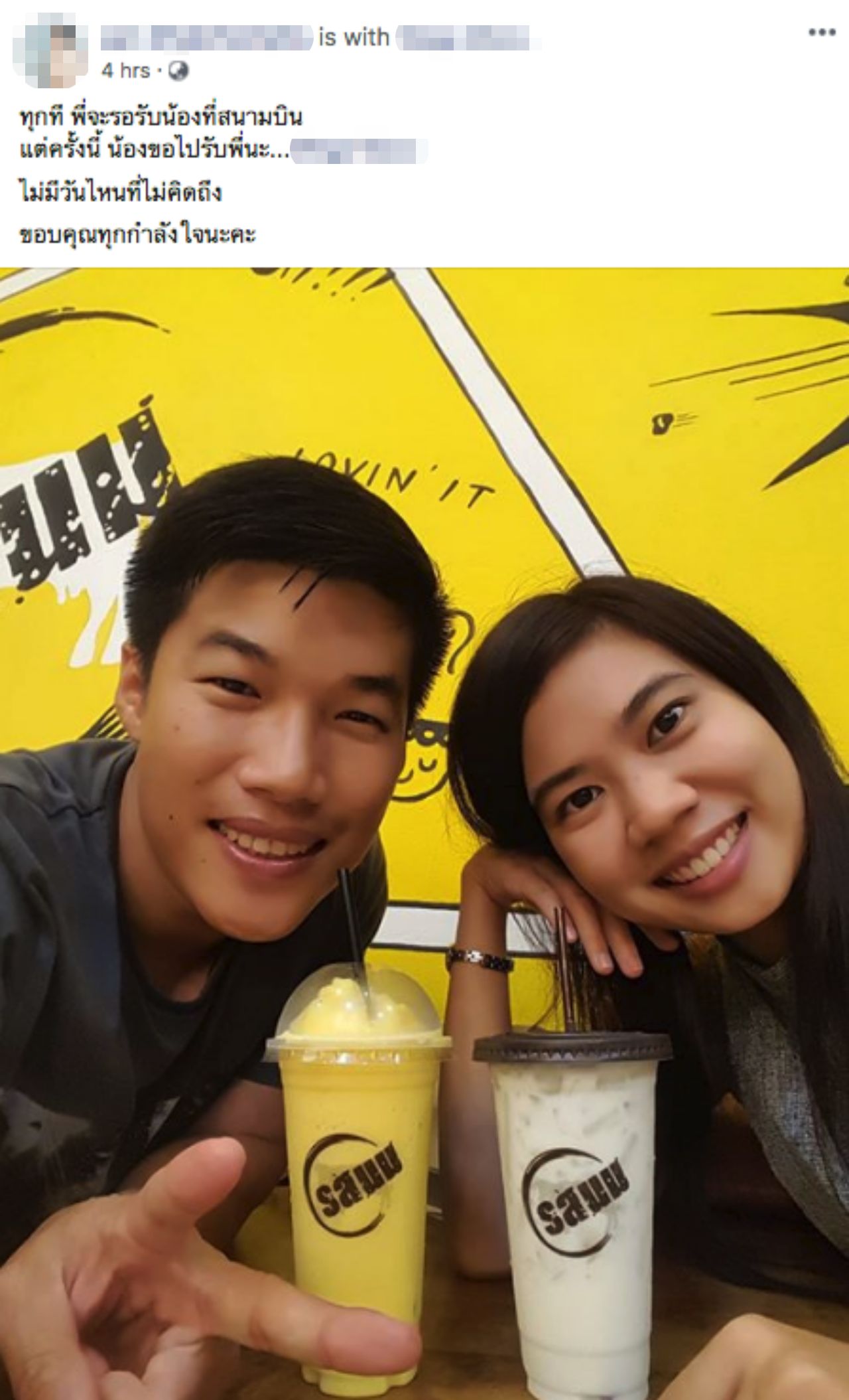 “ทุกที พี่จะรอรับน้องที่สนามบิน แต่ครั้งนี้ น้องขอไปรับพี่นะ... ไม่มีวันไหนที่ไม่คิดถึง ขอบคุณทุกกำลังใจนะคะ”