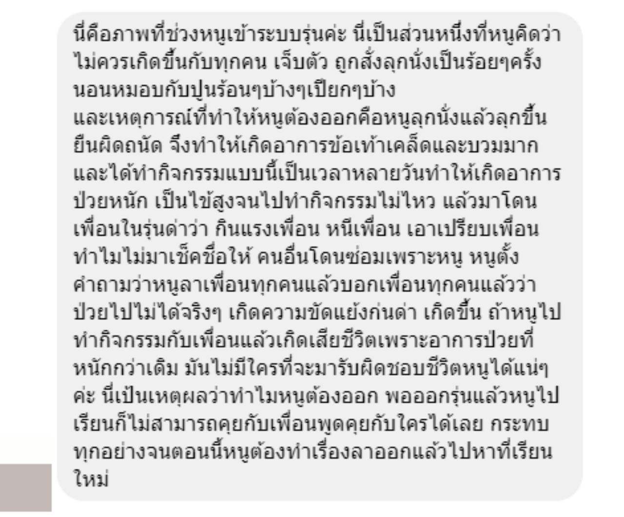 โดยมีนักศึกษาสาวคนหนึ่ง เล่าว่า ช่วงที่เข้าระบบรุ่น ถูกสั่งให้ลุกนั่งเป็นร้อยๆ ครั้ง นอนหมอบกับปูนร้อนๆ บ้างก็เปียก ถูกสั่งลุกนั่งและลุกขึ้นยืนกะทันหันทำให้ข้อเท้าเคล็ดและบวมมาก และมีอาการป่วยหนัก ไข้ขึ้นสูงจนไม่สามารถไปทำกิจกรรมไหว จึงถูกเพื่อนในรุ่นต่อว่า หาว่ากินแรงเพื่อน เอาเปรียบคนอื่น เกิดความขัดแย้งก่นด่ากัน ไม่มีใครพูดด้วยจนกระทบถึงการเรียน ตอนนี้ต้องทำเรื่องลาออกไปหาที่เรียนใหม่