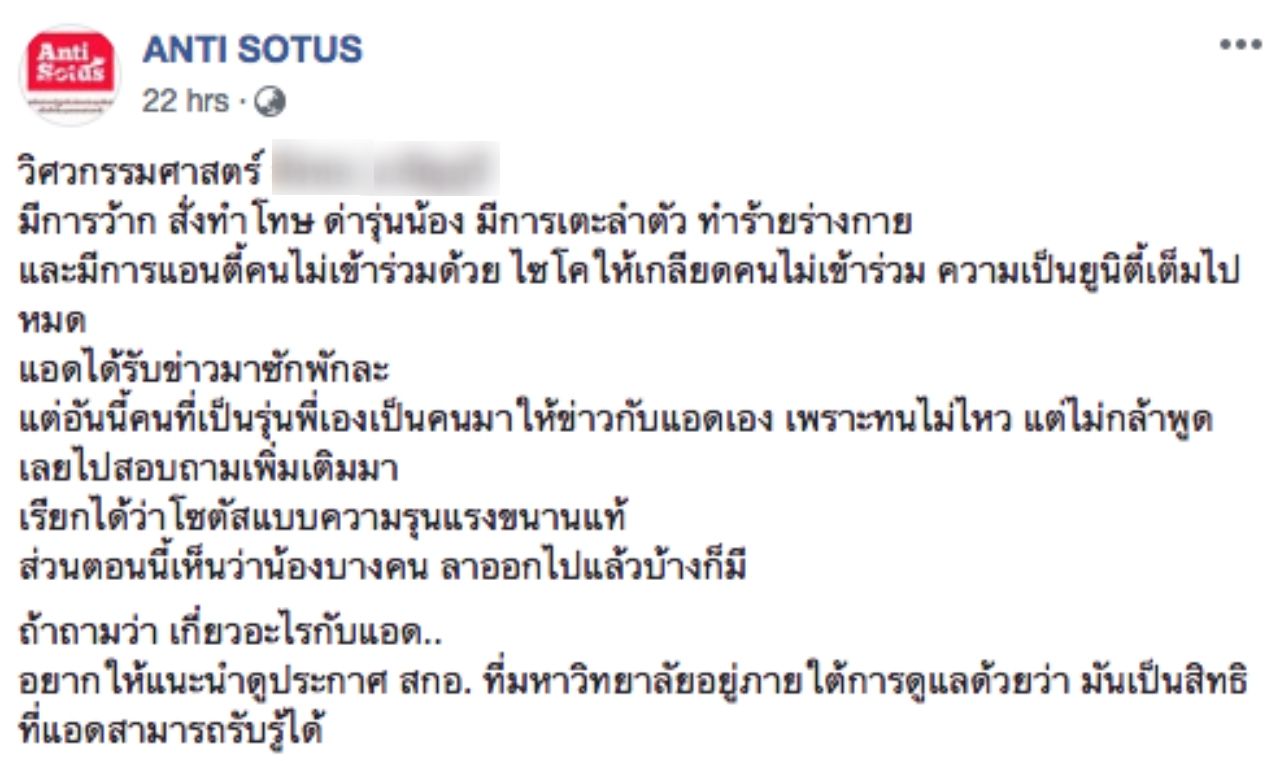 แฟนเพจ ANTI SOTUS ได้รับการร้องเรียนว่า การรับน้องของคณะวิศวกรรมศาสตร์ สาขาหนึ่ง ของมหาวิทยาลัยชื่อดัง มีการว้าก สั่งทำโทษ ด่ารุ่นน้อง ทำร้ายร่างกายรุ่นน้อง รวมทั้งปลุกปั่นให้แอนตี้คนที่ไม่เข้าร่วมกิจกรรมรับน้อง