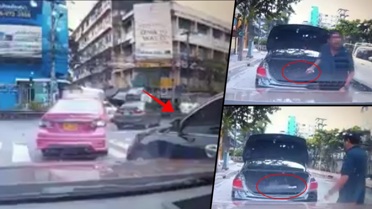 จากคลิปช่วงวินาทีที่ 14 เห็นหน้ารถคู่กรณีสีดำคันนี้โผล่เข้ามาในกล้อง และพยายามจะแทรกเข้ามาในเลนให้ได้ เมื่อถึงช่วยเลี้ยวรถคันสีดำนี้ขับแซงขึ้นไปก่อนจะถึงช่วงที่เบรกกลางถนน ชายเสื้อดำคนขับลงมาเปิดท้ายรถหยิบอาวุธคล้ายมีดลงมาด้วยอารมณ์ฉุนเฉียว โดยมีเสียงหญิงคนนี้บอกเล่าว่าประตูรถถูกกระชากและชายคนนี้คล้ายพร้อมจะฆ่าคนได้ตลอดเวลา กระทั่งต่อมาโยนอาวุธกลับเข้าท้ายรถแล้วขับออกไป.