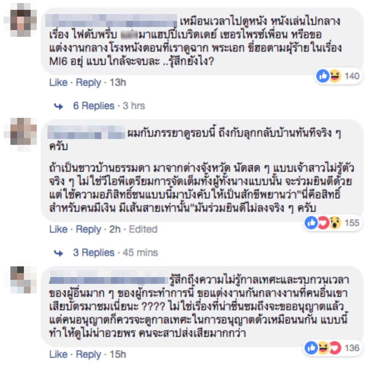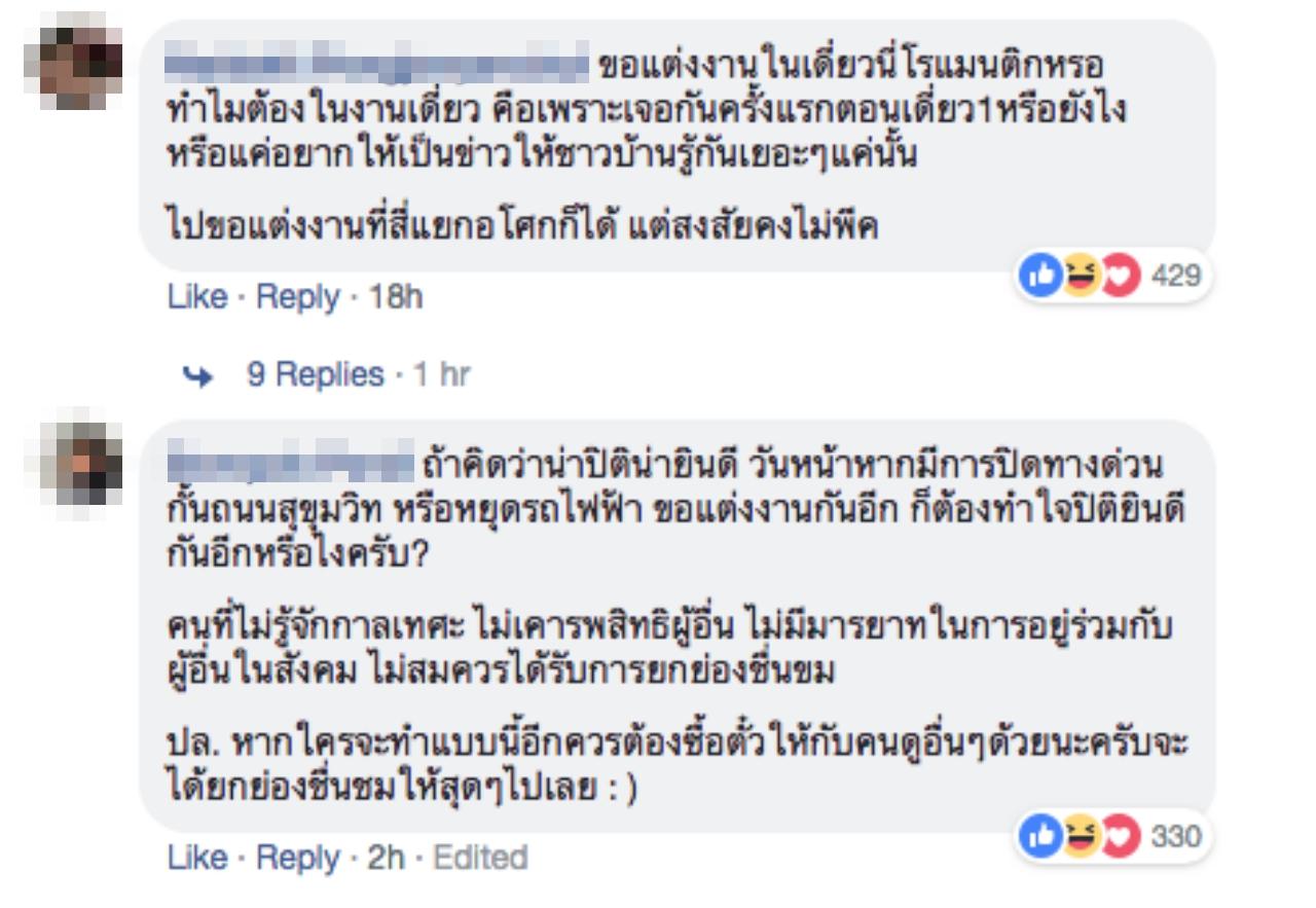 ทั้งนี้พบว่า ได้มีคนเข้ามาแสดงความคิดเห็นกันจำนวนมาก โดยส่วนใหญ่ไม่เห็นด้วยกับการขอแต่งงาน เนื่องจากมองว่าเบียดเบียนเวลาของผู้อื่น และบางส่วนมองว่า ไม่ได้รู้สึกว่าเป็นการเบียดเบียนเวลาแต่อย่างใด เพราะการขอแต่งงานไม่ได้กินเวลานานขนาดนั้น โดยมีความคิดเห็นดังนี้