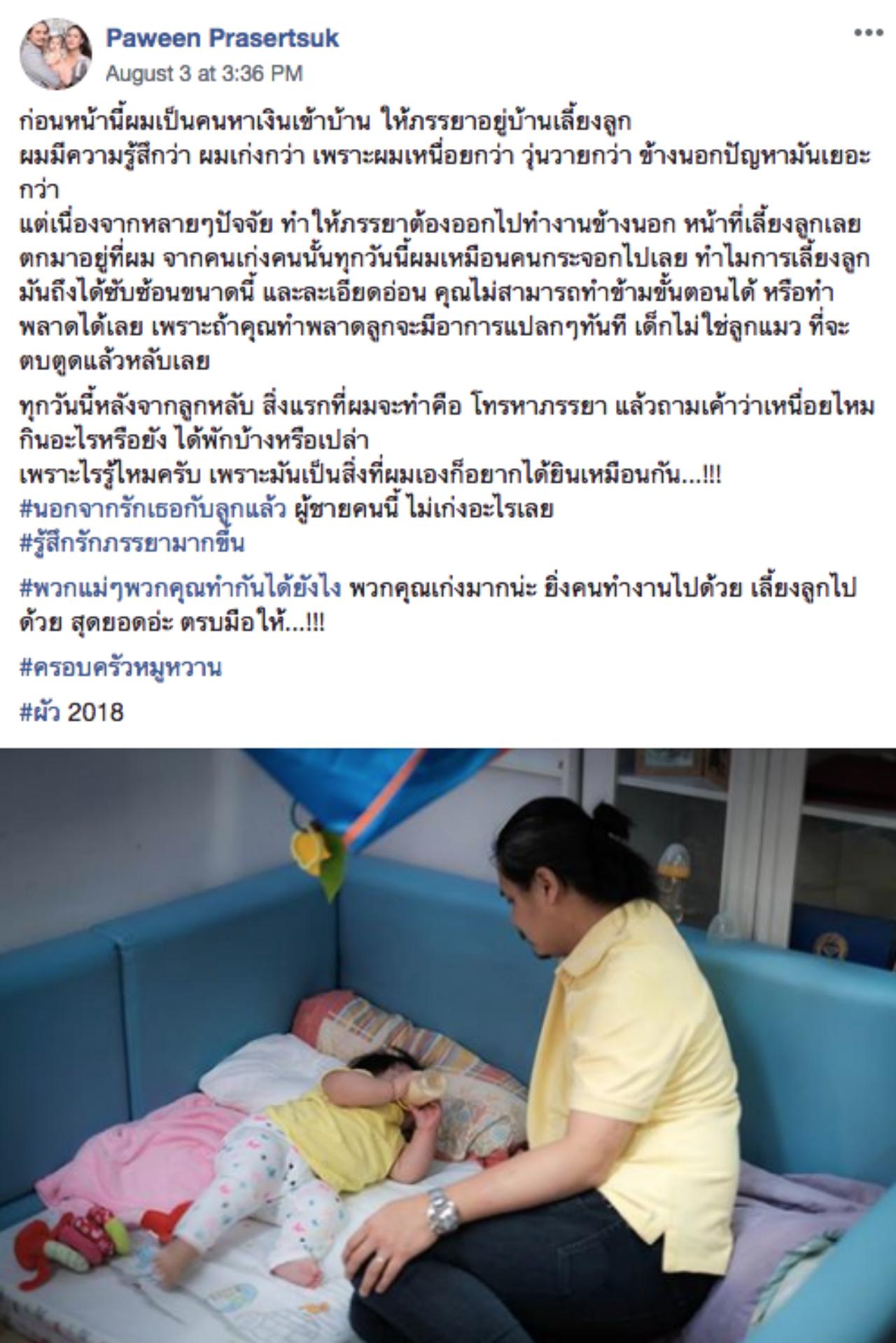 แฟนเพจ Paween Prasertsuk ซึ่งเป็นคุณสามี ได้โพสต์ลงในกลุ่ม HerKid รวมพลคนเห่อลูก ว่า "ก่อนหน้านี้ผมเป็นคนหาเงินเข้าบ้าน ให้ภรรยาอยู่บ้านเลี้ยงลูก ผมมีความรู้สึกว่า ผมเก่งกว่า เพราะผมเหนื่อยกว่า วุ่นวายกว่า ข้างนอกปัญหามันเยอะกว่า แต่เนื่องจากหลายๆปัจจัย ทำให้ภรรยาต้องออกไปทำงานข้างนอก หน้าที่เลี้ยงลูกเลยตกมาอยู่ที่ผม