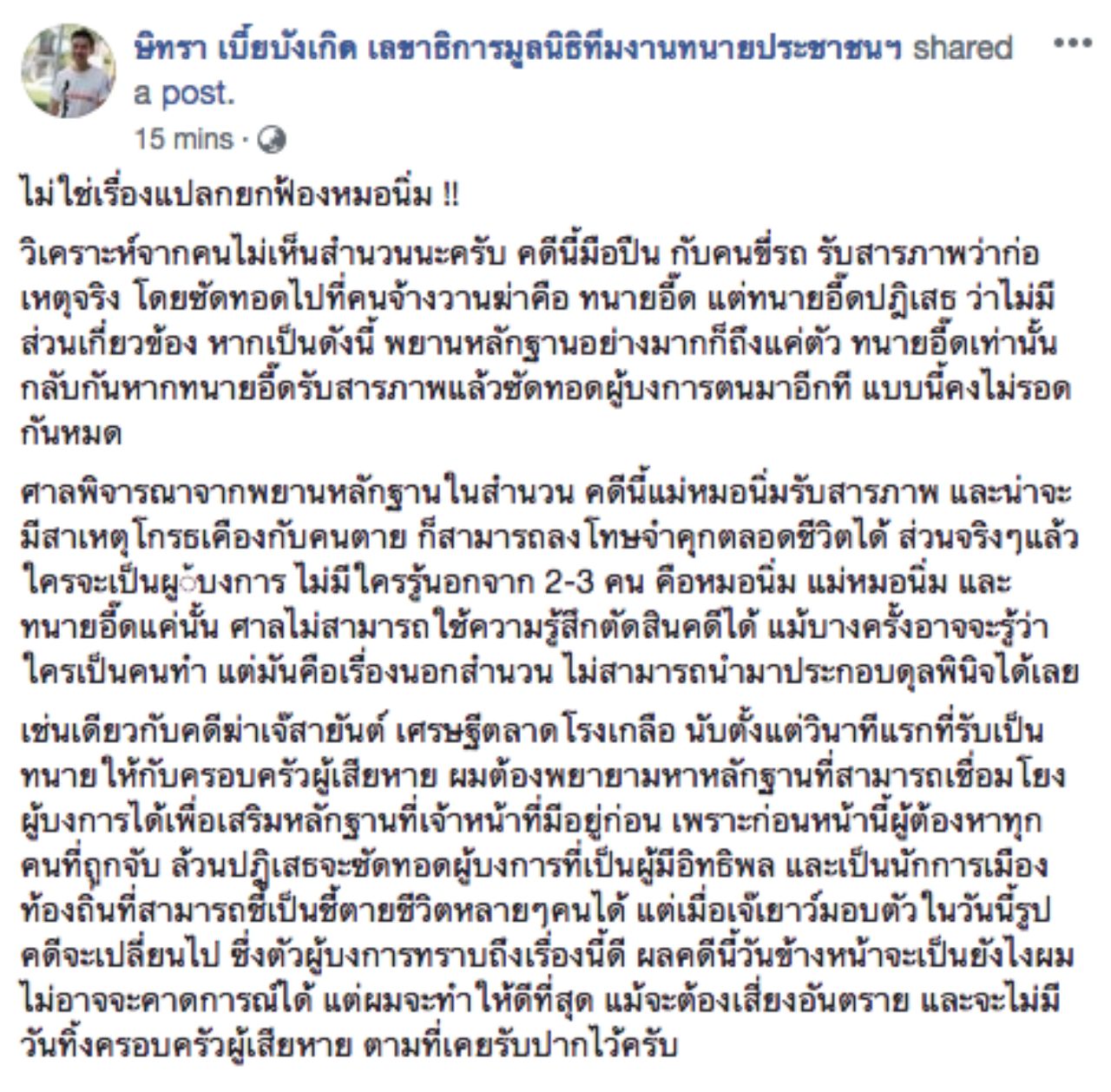 วันที่ 7 ส.ค.61 นายษิทรา เบี้ยบังเกิด เลขาธิการมูลนิธิทีมงานทนายประชาชนฯ หรือ ทนายตั้ม โพสต์ผ่านแฟนเพจเฟซบุ๊กถึงคดีจ้างวานฆ่านายจักรกฤษณ์ หรือ เอ็กซ์ พณิชย์ผาติกรรม อดีตนักกีฬายิงปืนทีมชาติไทย โดยระบุว่า ไม่ใช่เรื่องแปลกยกฟ้องหมอนิ่ม !! วิเคราะห์จากคนไม่เห็นสำนวนนะครับ คดีนี้มือปืน กับคนขี่รถ รับสารภาพว่าก่อเหตุจริง โดยซัดทอดไปที่คนจ้างวานฆ่าคือ ทนายอี๊ด แต่ทนายอี๊ดปฏิเสธ ว่าไม่มีส่วนเกี่ยวข้อง หากเป็นดังนี้ พยานหลักฐานอย่างมากก็ถึงแค่ตัวทนายอี๊ดเท่านั้น กลับกันหากทนายอี๊ดรับสารภาพแล้วซัดทอดผู้บงการตนมาอีกที แบบนี้คงไม่รอดกันหมด