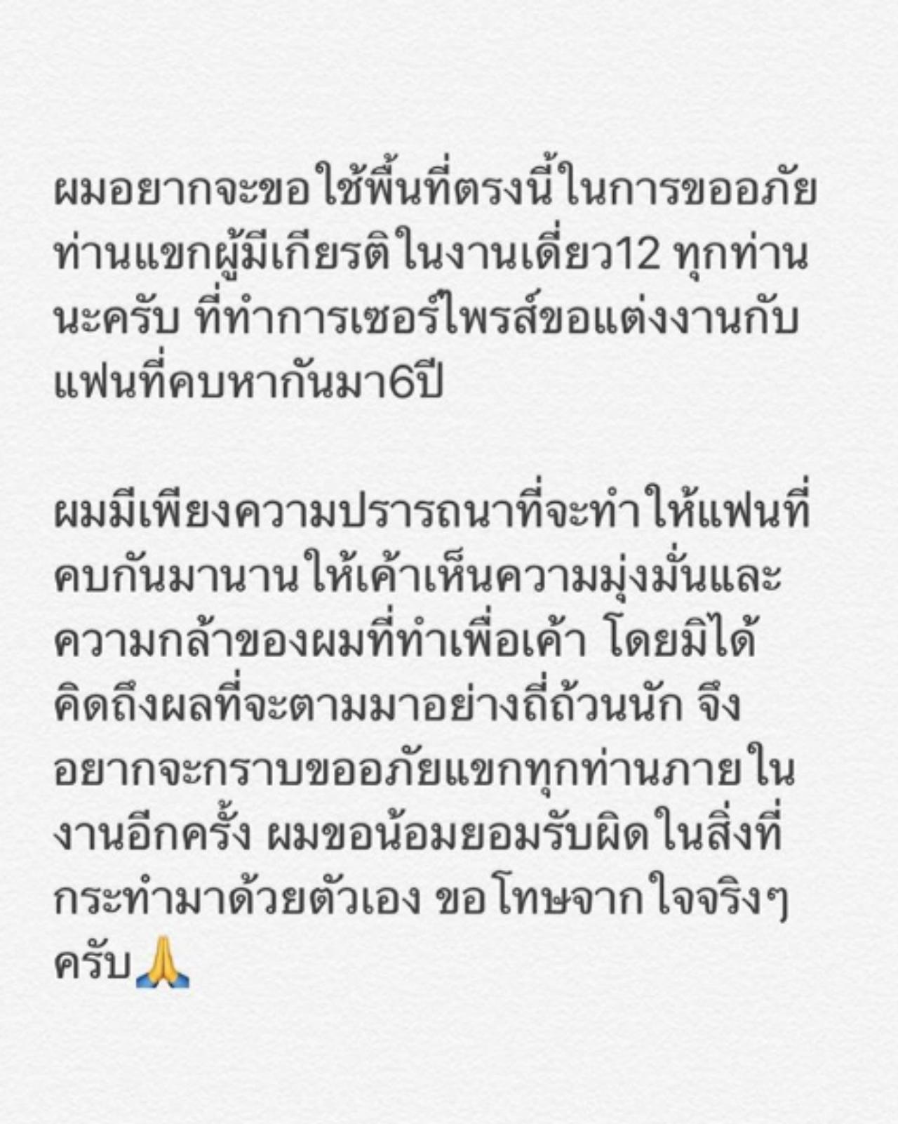 ผมมีเพียงความปรารถนาที่จะทำให้แฟนที่คบกันมานานให้เขาเห็นความมุ่งมั่นและความกล้าของผมที่ทำเพื่อเขา โดยมิได้คิดถึงผลที่จะตามมาอย่างถี่ถ้วนนัก จึงอยากจะกราบขออภัยแขกทุกท่านในงานอีกครั้ง ผมขอน้อมยอมรับผิดในสิ่งที่กระทำมาด้วยตัวเอง ขอโทษจากใจจริงๆ ครับ"