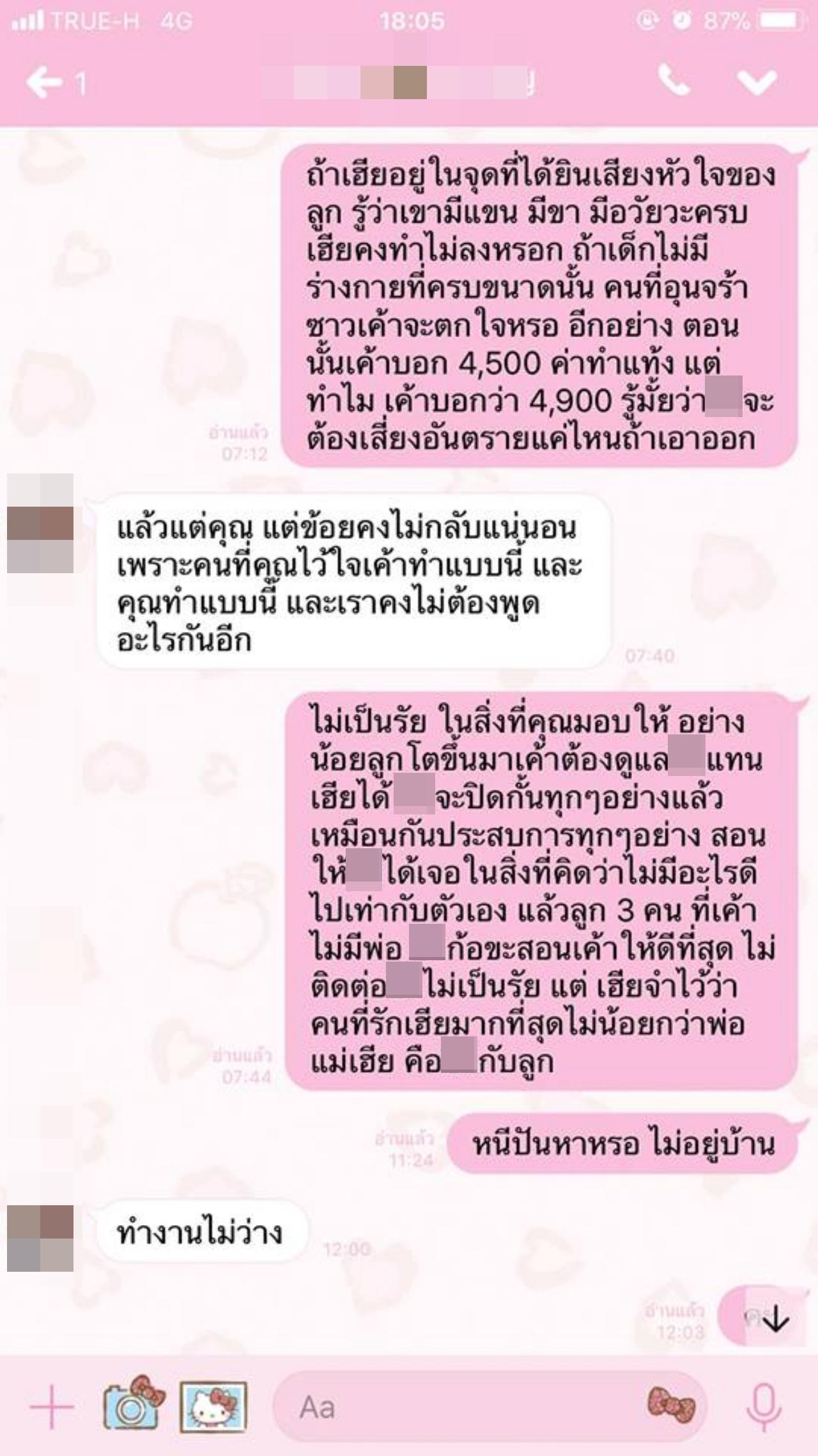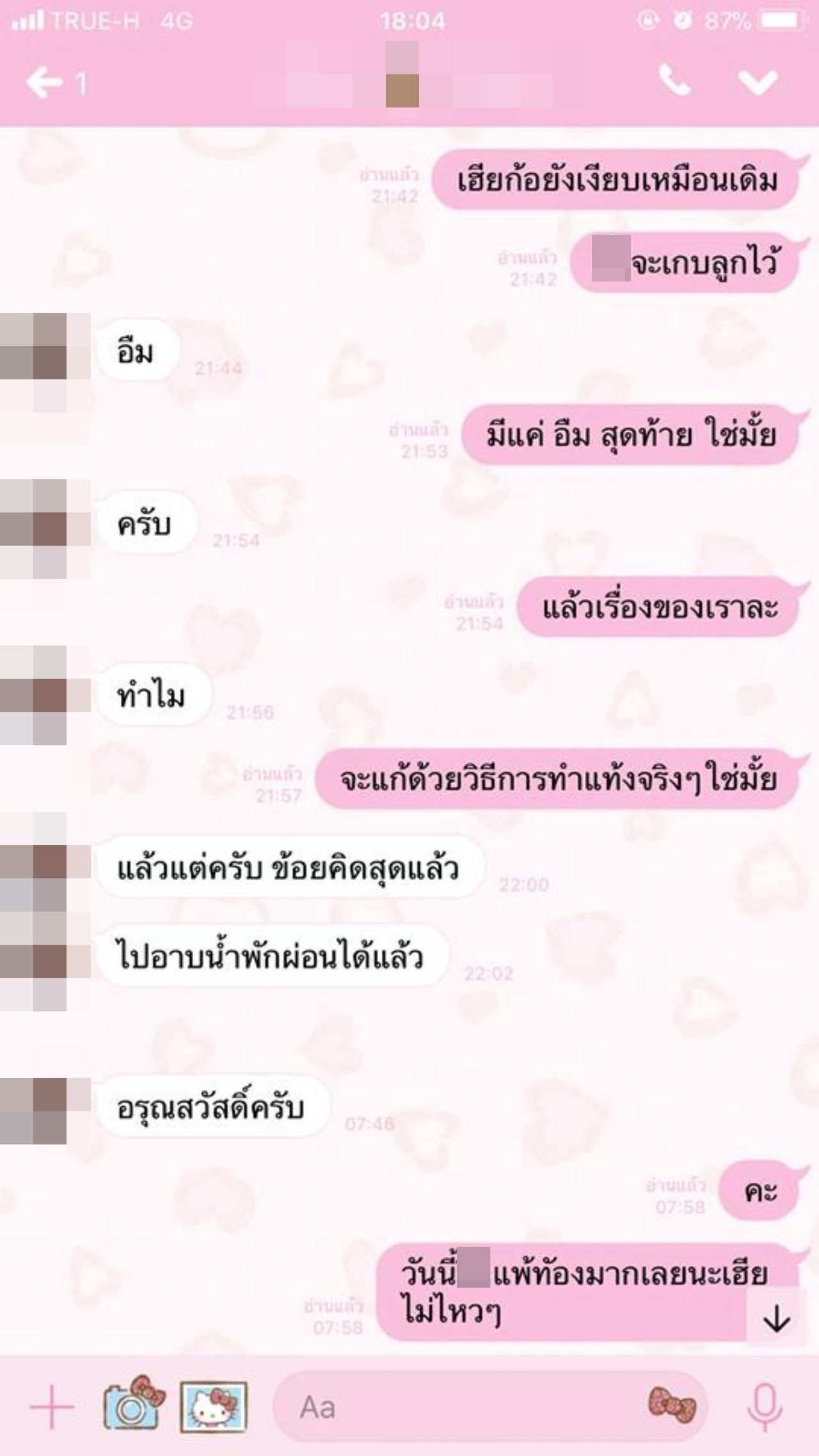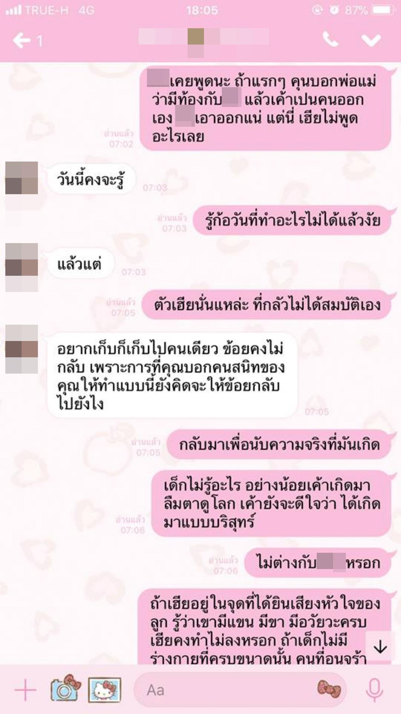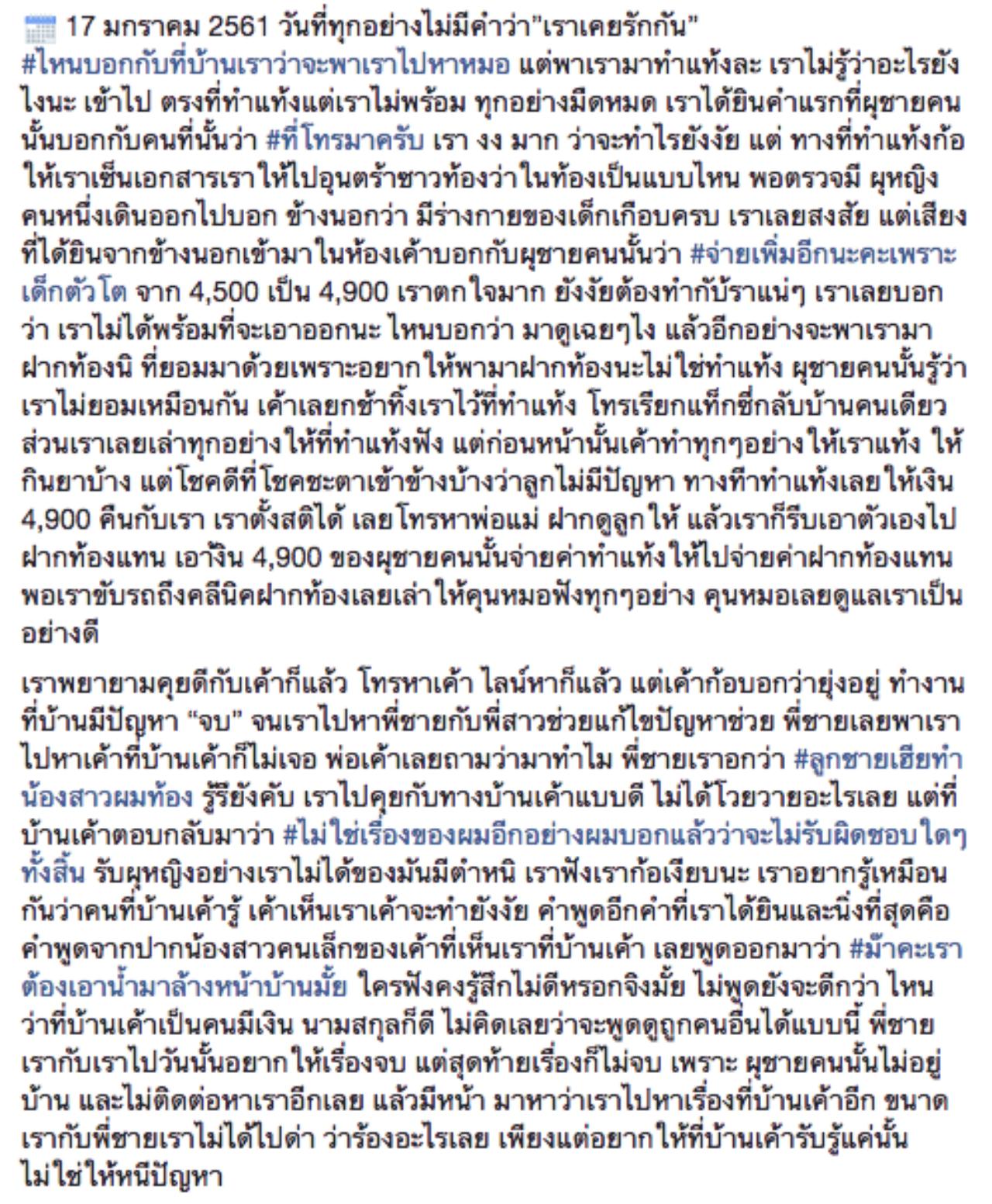 จนกระทั่งวันที่ 28 พ.ย.60 ตนได้ตั้งท้องกับผู้ชายคนนี้ แต่อีกฝ่ายกลับหนีปัญหา พูดเพียงว่าให้ไปเอาเด็กออก และได้ออกอุบายบอกกับตนว่าจะพาฝากท้อง แต่ที่จริงแล้วกลับพาไปทำแท้ง โชคดีที่ตนรู้ตัวก่อนจึงไม่ได้เอาเด็กออก และตั้งแต่วันนี้ผู้ชายคนนี้ก็พยายามบ่ายเบี่ยง ไม่แสดงความรับผิดชอบใดๆ ทั้งสิ้น รวมทั้งไปบอกกับคนอื่นว่า "ไม่ได้ทำเราท้อง"