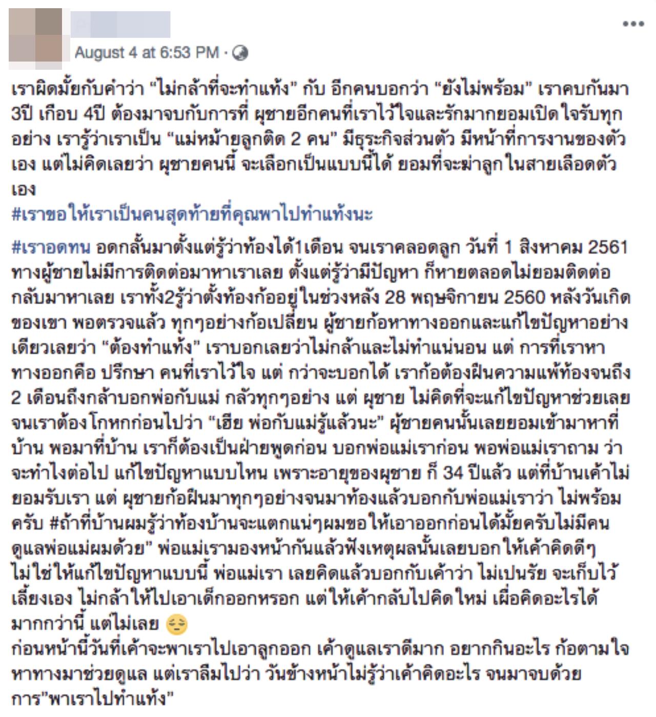 ผู้สื่อข่าวรายงานว่า ผู้ใช้เฟซบุ๊กรายหนึ่งได้โพสต์ข้อความว่า เราผิดไหมกับคำว่า "ไม่กล้าที่จะทำแท้ง" กับ อีกคนบอกว่า "ยังไม่พร้อม" โดยเล่าว่า ตนเองเป็นแม่ม่าย มีลูกติด 2 คน มีธุรกิจส่วนตัว มีหน้าที่การงานเป็นของตัวเอง และได้คบหากับผู้ชายคนหนึ่ง อายุ 34 ปี เป็นเวลาเกือบ 4 ปี