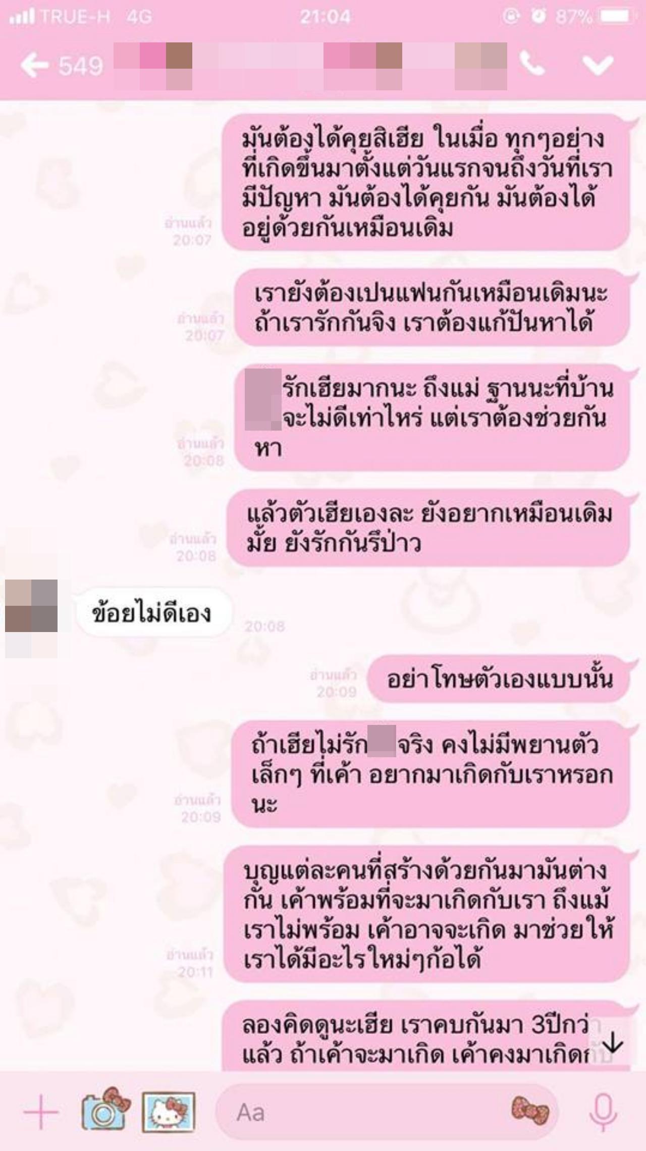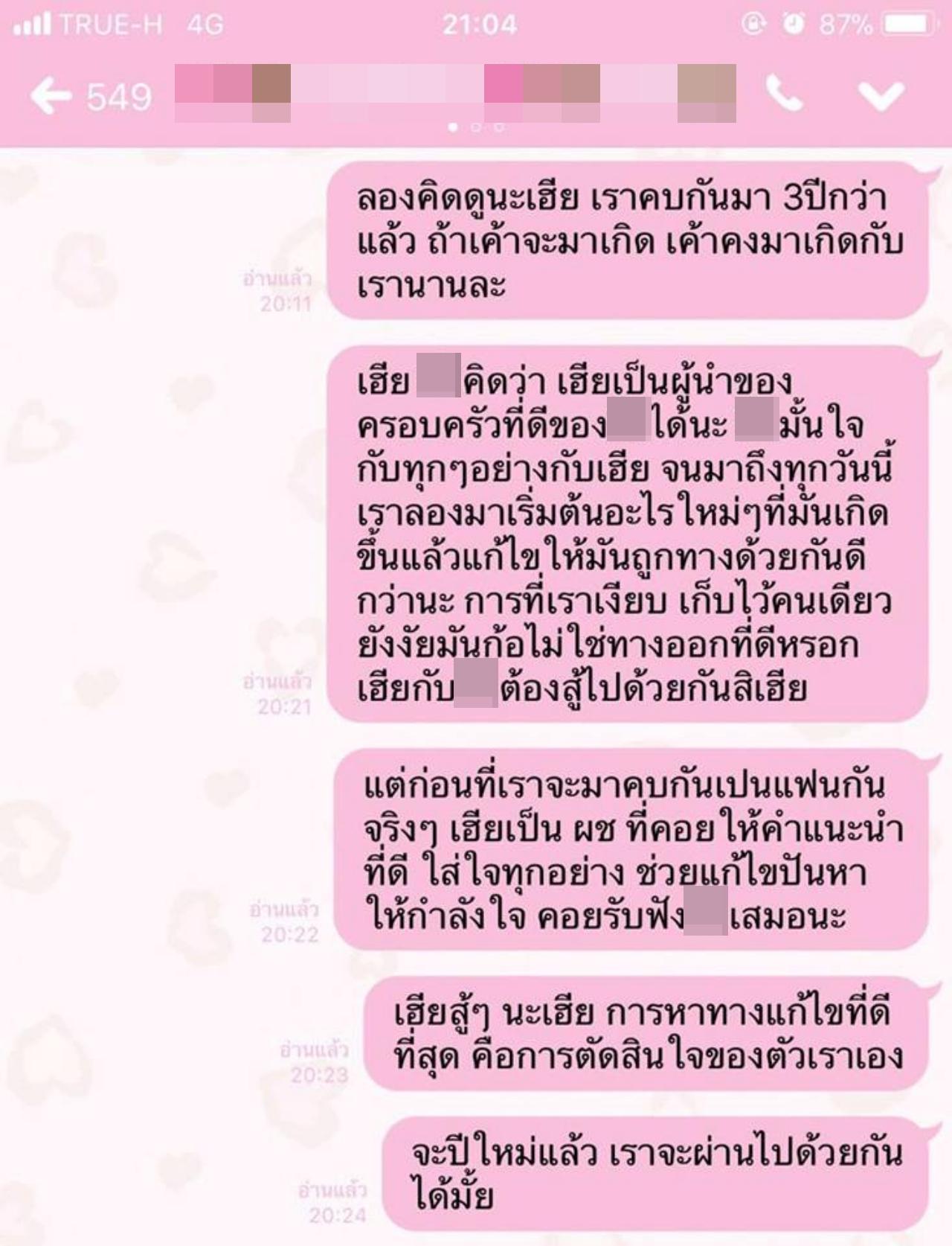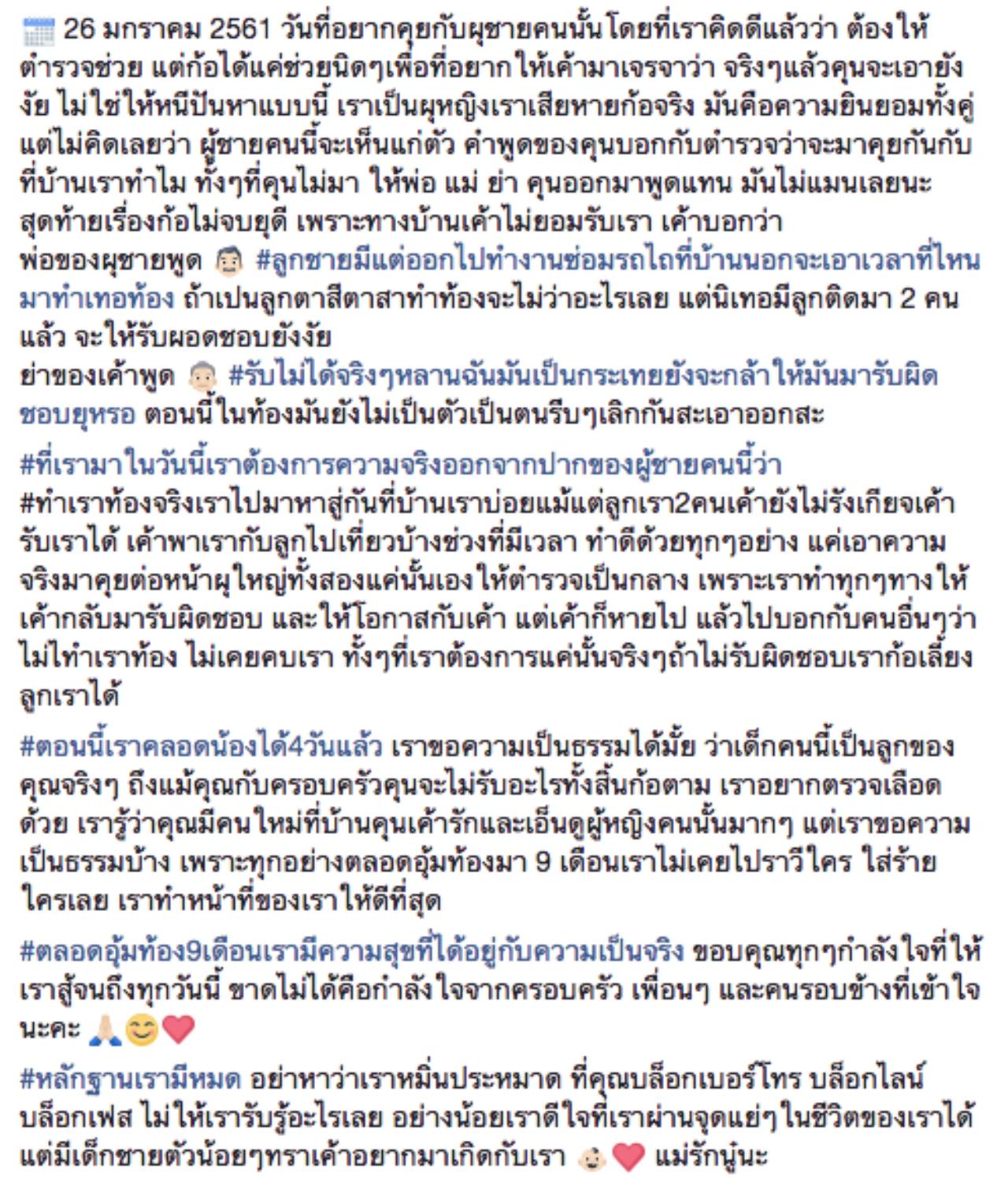 ในวันนี้ตนได้คลอดลูกแล้ว และรู้ว่าคุณมีผู้หญิงคนใหม่ ซึ่งเป็นคนที่ครอบครัวของคุณรักและเอ็นดูมาก แต่ตนก็อยากขอความเป็นธรรมเพราะทุกอย่างตลอดอุ้มท้องมา 9 เดือนตนไม่เคยไปราวีใคร ใส่ร้ายใครเลย และขอตนเป็นคนสุดท้ายที่คุณจะพาไปทำแท้ง ทั้งนี้ตนต้องขอบคุณทุกกำลังใจจากครอบครัว เพื่อนๆ และคนรอบข้างที่เข้าใจ อย่างน้อยตนก็ดีใจที่ผ่านจุดแย่ๆ ในชีวิตมาได้ มีเด็กชายตัวน้อยๆ ที่เขาอยากมาเกิดกับเรา "แม่รักหนูนะ".