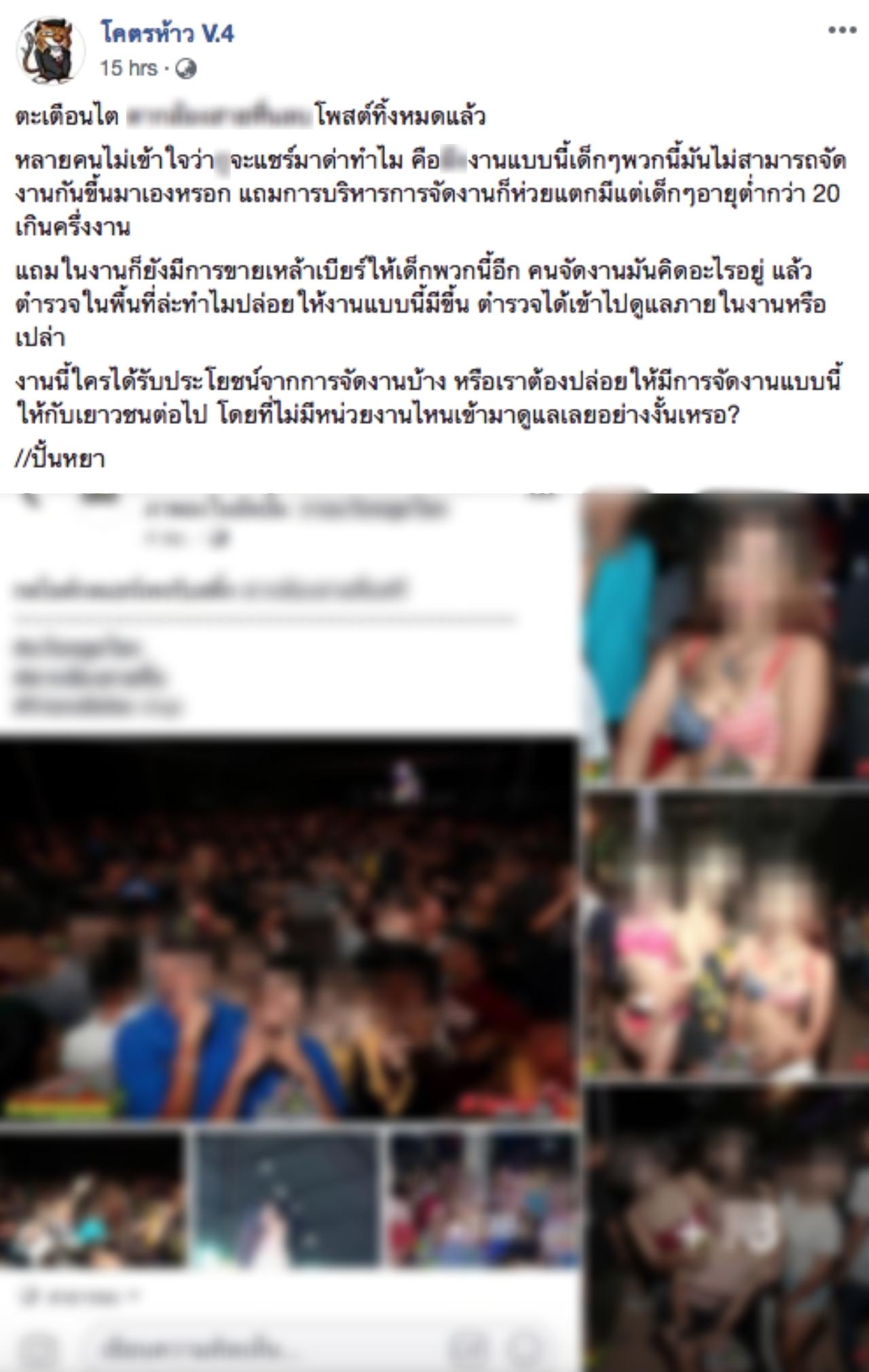แฟนเพจ โคตรห้าว V.4 ได้โพสต์ภาพภายในงานแห่งหนึ่งที่เป็นการรวมตัวของเด็กวัยรุ่นที่ชื่นชอบความเร็ว โดยพบว่ามีการปล่อยให้เด็กอายุต่ำกว่า 20 ปีเข้าร่วมงาน โดยจะเห็นว่าเด็กผู้หญิงส่วนใหญ่ที่ร่วมงานมีการแต่งตัวล่อแหลมและถือเครื่องดื่มแอลกอฮอล์กันอย่างเปิดเผย