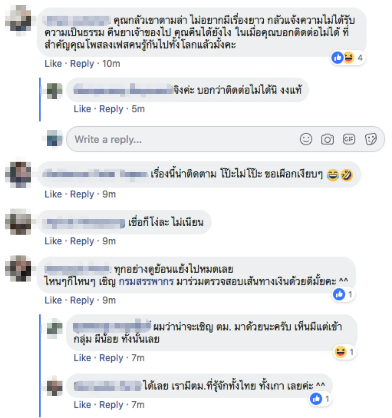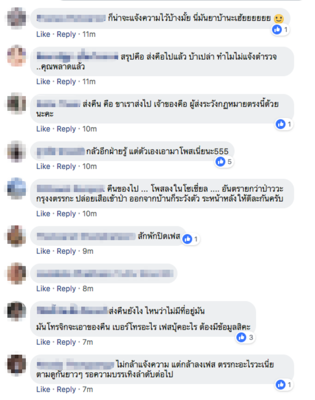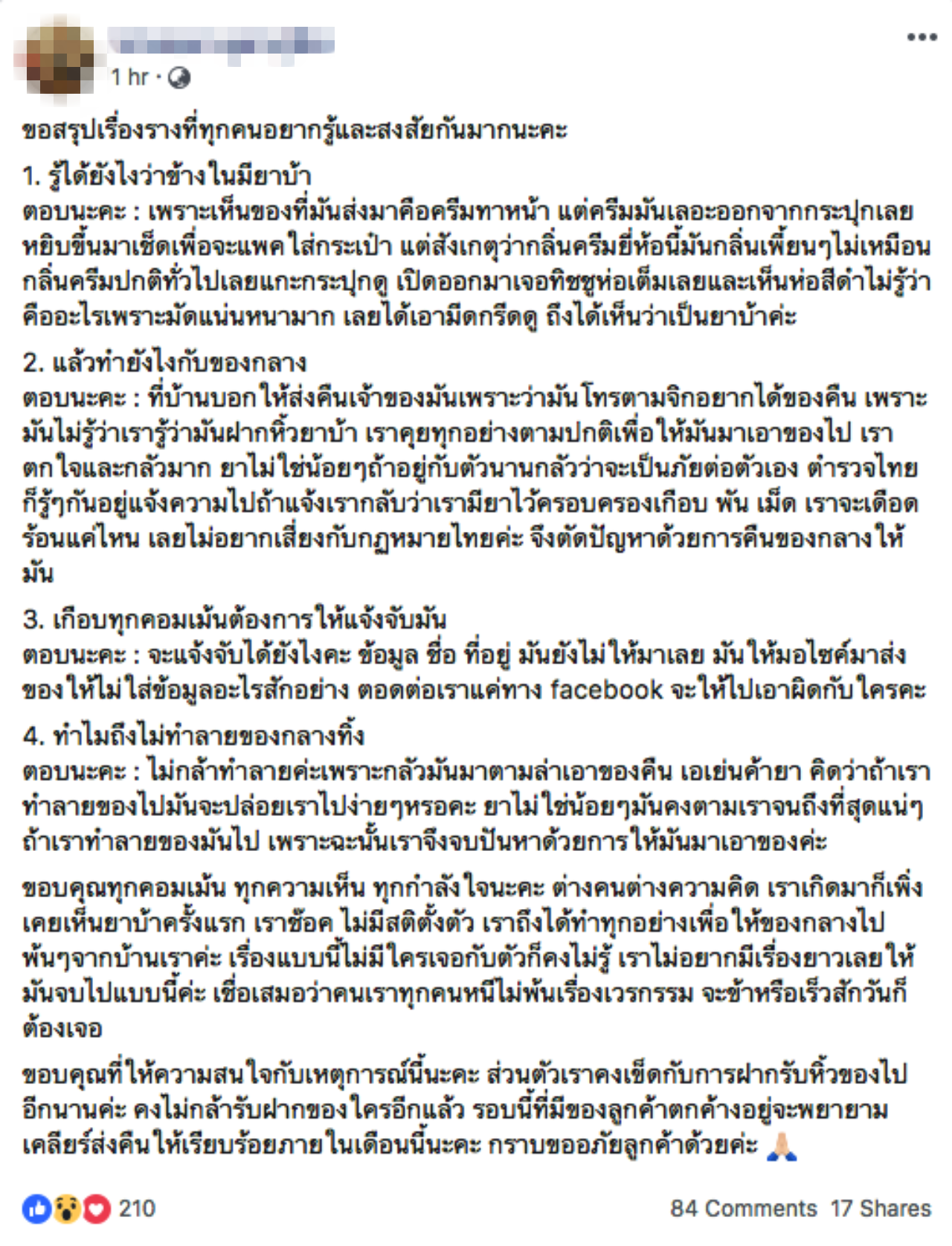 ส่วนเรื่องแจ้งจับ ผู้โพสต์บอกว่า ข้อมูล ชื่อที่อยู่ผู้ส่งไม่ได้ให้มา แต่ให้มอเตอร์ไซค์มาส่ง ติดต่อแค่ทางเฟซบุ๊กจะให้ไปเอาผิดกับใคร และที่ไม่ทำลายของกลางเพราะกลัวเอเย่นต์มาตามล่าเอาของคืน