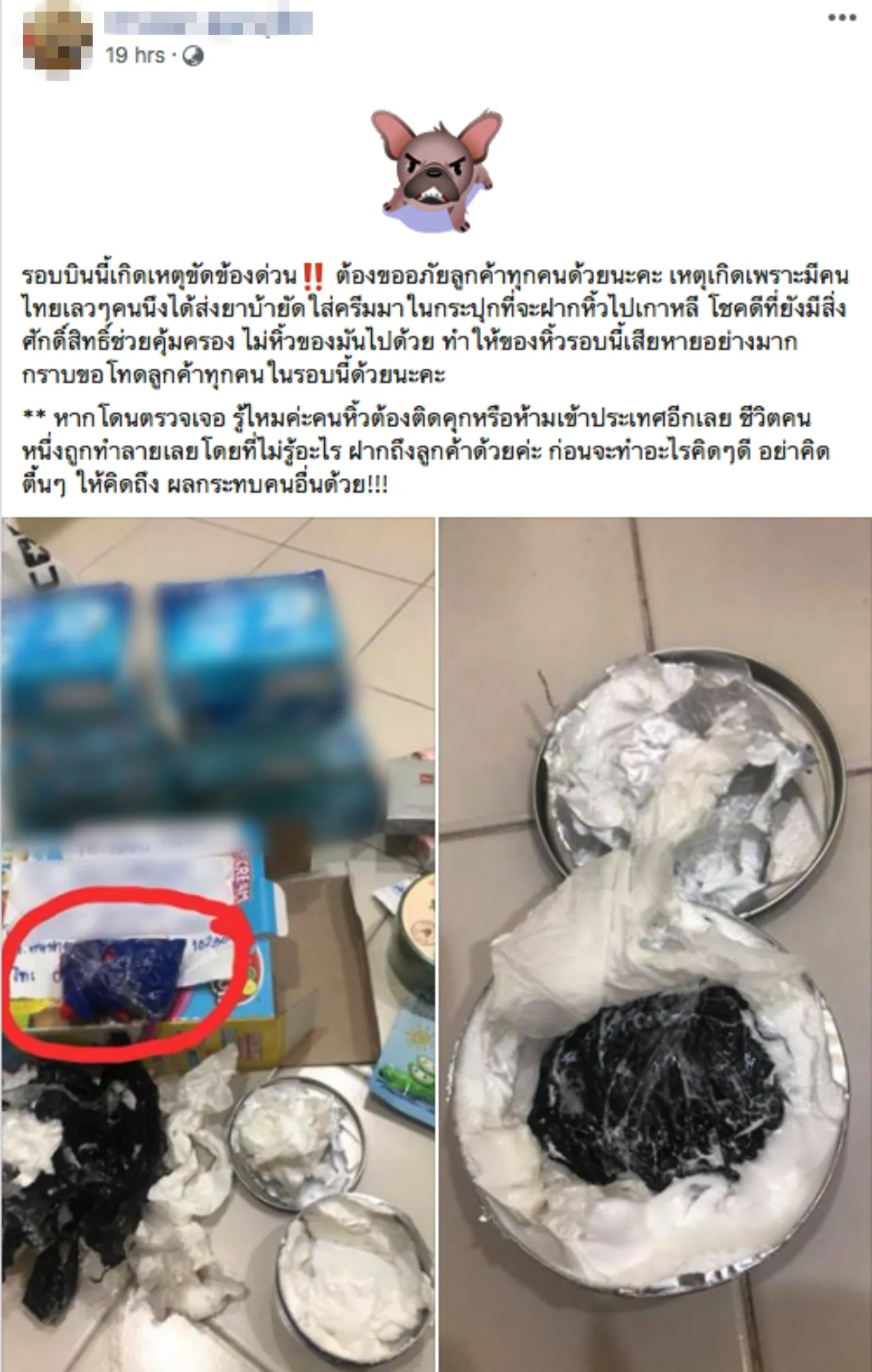 ผู้ใช้เฟซบุ๊กรายหนึ่งซึ่งเป็นแม่ค้าออนไลน์ที่รับหิ้วของจากไทยไปเกาหลี และจากเกาหลีมาไทย โพสต์ภาพครีมกระปุกหนึ่งที่ผู้โพสต์อ้างว่ามียาบ้ายัดอยู่ข้างใน พร้อมข้อความว่า “รอบบินนี้เกิดเหตุขัดข้องด่วน ต้องขออภัยลูกค้าทุกคนด้วยนะคะ เหตุเกิดเพราะมีคนไทยเลวๆ คนนึงได้ส่งยาบ้ายัดใส่ครีมมาในกระปุกที่จะฝากหิ้วไปเกาหลี โชคดีที่ยังมีสิ่งศักดิ์สิทธิ์ช่วยคุ้มครอง ไม่หิ้วของมันไปด้วย ทำให้ของหิ้วรอบนี้เสียหายอย่างมาก กราบขอโทษลูกค้าทุกคนในรอบนี้ด้วยนะคะ