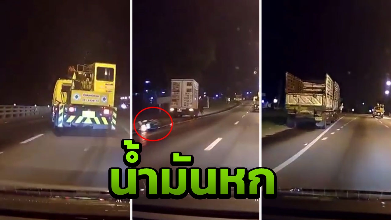 จากคลิปขณะรถกำลังข้ามสะพาน และมีคันข้างหน้าอยู่เลนซ้าย แต่ขณะที่ตีไฟเลี้ยวออกเลนขวาคล้ายมีอาการเสียหลักลื่น หรือหักหลบบางสิ่งบางอย่าง แต่โชคดีที่ไม่พลิกคว่ำและคนขับประคองรถต่อไปได้อย่างปลอดภัย ทั้งนี้ ในคลิปจะเห็นว่าถนนเลนซ้ายมันเปียกด้วยน้ำมันยาวไปจนถึงรถพ่วงที่จอดอยู่ริมทาง ซึ่งในระหว่างนั้นมอเตอร์ไซค์ที่ขับนำหน้ามาก็ล้มลงเพราะคาดว่าลื่นน้ำมันบนถนนเช่นกัน.