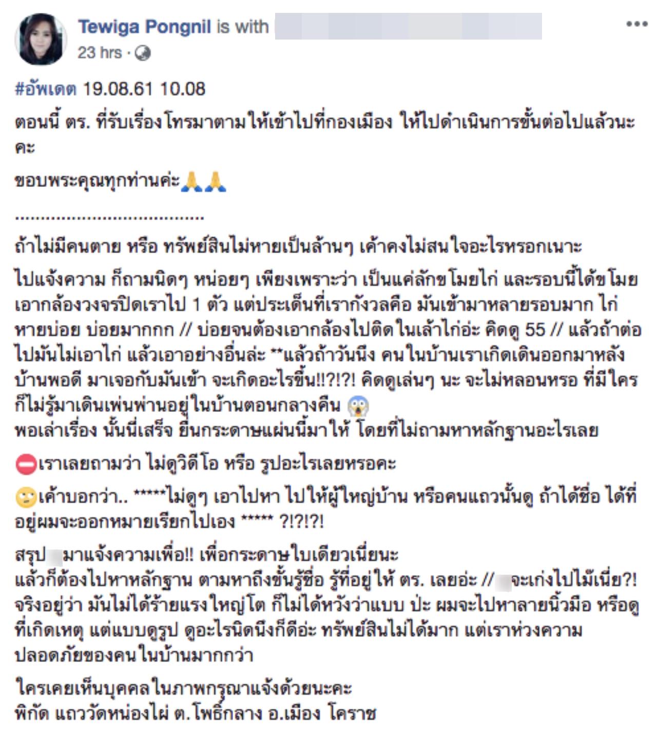 แต่ประเด็นที่กังวลก็คือ โจรได้เข้ามาขโมยของหลายรอบมากและถ้าต่อไปไม่ได้ขโมยแค่ไก่ แต่หันไปขโมยอย่างอื่น แล้วหากคนในบ้านเกิดบังเอิญเดินไปเจอ จะเกิดอะไรขึ้น? คิดดูเล่นๆ นะ จะไม่หลอนเหรอที่มีใครก็ไม่รู้มาเดินเพ่นพ่านอยู่ในบ้านตอนกลางคืน หลังจากเล่าเรื่องเสร็จตำรวจก็ได้ยื่นกระดาษมาให้ ไม่ยอมดูหลักฐานอะไรเลย บอกเพียงว่าเอาไปให้ผู้ใหญ่บ้านหรือคนแถวนั้นดู ถ้าได้ชื่อที่อยู่จะออกหมายเรียกเอง ทั้งนี้ผู้โพสต์จึงขอความร่วมมือ หากใครเห็นชายคนในคลิปให้ส่งรายละเอียดมาให้ด้วย พิกัดแถววัดหน่องไผ่ ต.โพธิ์กลาง อ.เมือง โคราช
