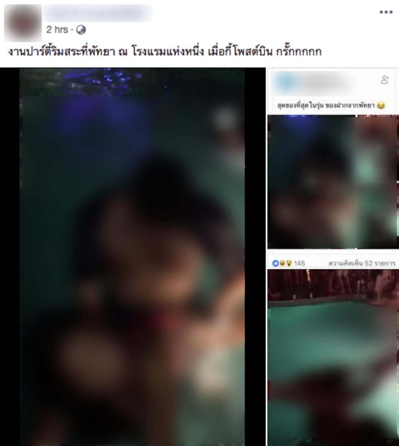 วันที่ 19 ส.ค. 61 มีรายงานว่า โลกออนไลน์ได้แชร์คลิปวิดีโอภายในงานปาร์ตี้แห่งหนึ่ง ที่ระบุว่า เป็นปาร์ตี้ริมสระว่ายน้ำในโรงแรมแห่งหนึ่งในพัทยา จ.ชลบุรี จากคลิปจะเห็นว่ามีชายชาวต่างชาติกำลังทำท่าคล้ายมีเพศสัมพันธ์กับหญิงสาวที่สวมบิกินีสีชมพูในสระว่ายน้ำ โดยไม่สนสายตาคนจำนวนมากที่ยืนเต้นกันอยู่ริมสระน้ำ ทำให้หลายคนต่างวิพากษ์วิจารณ์ถึงควาไม่เหมาะสมของคลิปดังกล่าวกันอย่างมาก