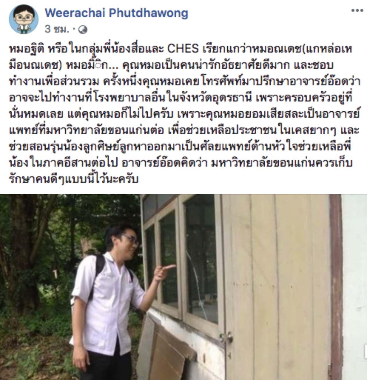 'ทีมไทยรัฐออนไลน์' พาไปสัมผัสอีกมุมของหมอฐิติ โดย รศ.ดร.วีรชัย พุทธวงศ์ อาจารย์ประจำคณะศิลปศาสตร์และวิทยาศาสตร์ มหาวิทยาลัยเกษตรศาสตร์ ได้โพสต์ผ่านเฟซบุ๊กส่วนตัวบอกเล่าความประทับใจที่มีต่อหมอฐิติว่า หมอฐิติ หรือในกลุ่มพี่น้องสื่อ และศูนย์ประสานงานบุคลากรในสถาบันอุดมศึกษาของรัฐ (CHES) เรียกแกว่า หมอณเดชน์ เพราะแกหล่อเหมือนณเดชน์