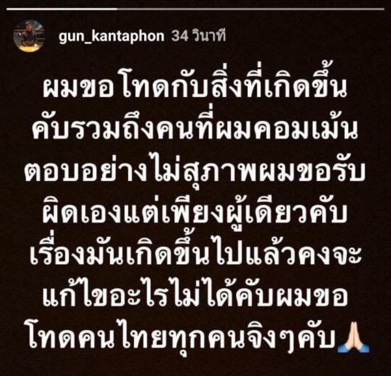 ก่อนที่ในเวลาต่อมา เจ้าตัวได้โพสต์ขอโทษทางไอจีสตอรี่ ว่า “ผมขอโทษกับสิ่งที่เกิดขึ้นครับ รวมถึงคนที่ผมคอมเม้นตตอบอย่างไม่สุภาพ ผมขอรับผิดเองแต่เพียงผู้เดียวครับ เรื่องมันเกิดขึ้นไปแล้วคงจะแก้ไขอะไรไม่ได้ครับ ผมขอโทษคนไทยทุกคนจริงๆ ครับ”