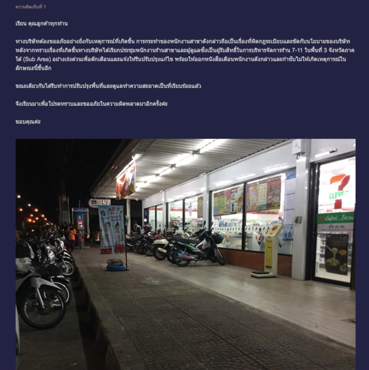 หลังจากทราบเรื่องที่เกิดขึ้นทางบริษัทได้เรียกประชุมพนักงานร้านสาขาและผู้ดูแลซึ่งเป็นผู้รับสิทธิ์ในการบริหารจัดการร้าน 7-11 ในพื้นที่ 3 จังหวัดภาคใต้ (Sub Area) อย่างเร่งด่วนเพื่อตักเตือนและแจ้งให้รีบปรับปรุงแก้ไข พร้อมให้ออกหนังสือเตือนพนักงานดังกล่าวและกำชับไม่ให้เกิดเหตุการณ์ในลักษณะนี้ขึ้นอีก ขณะเดียวกันได้รีบทำการปรับปรุงพื้นที่และดูแลทำความสะอาดเป็นที่เรียบร้อยแล้ว