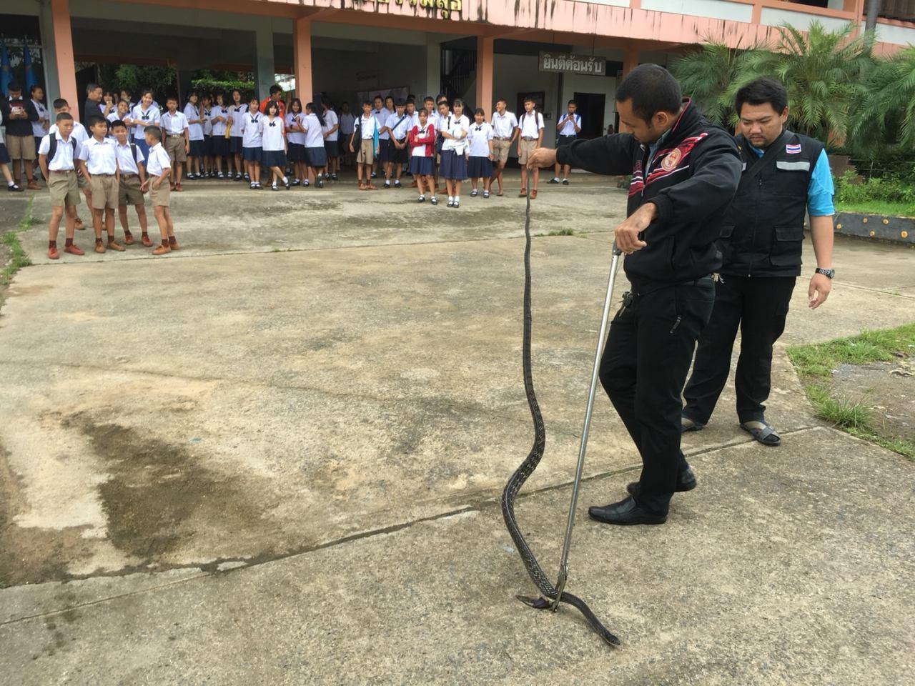 ทั้งนี้ พบงูขนาดใหญ่ชูคออยู่กลางสนามฟุตบอล สร้างความแตกตื่นให้กับครูและนักเรียนที่กำลังเข้าแถวเคารพธงชาติอยู่หน้าอาคารเรียน พากันกรีดร้อง และวิ่งหนีกระเจิดกระเจิง เจ้าหน้าที่จึงลงพื้นที่พร้อมอุปกรณ์จับงู