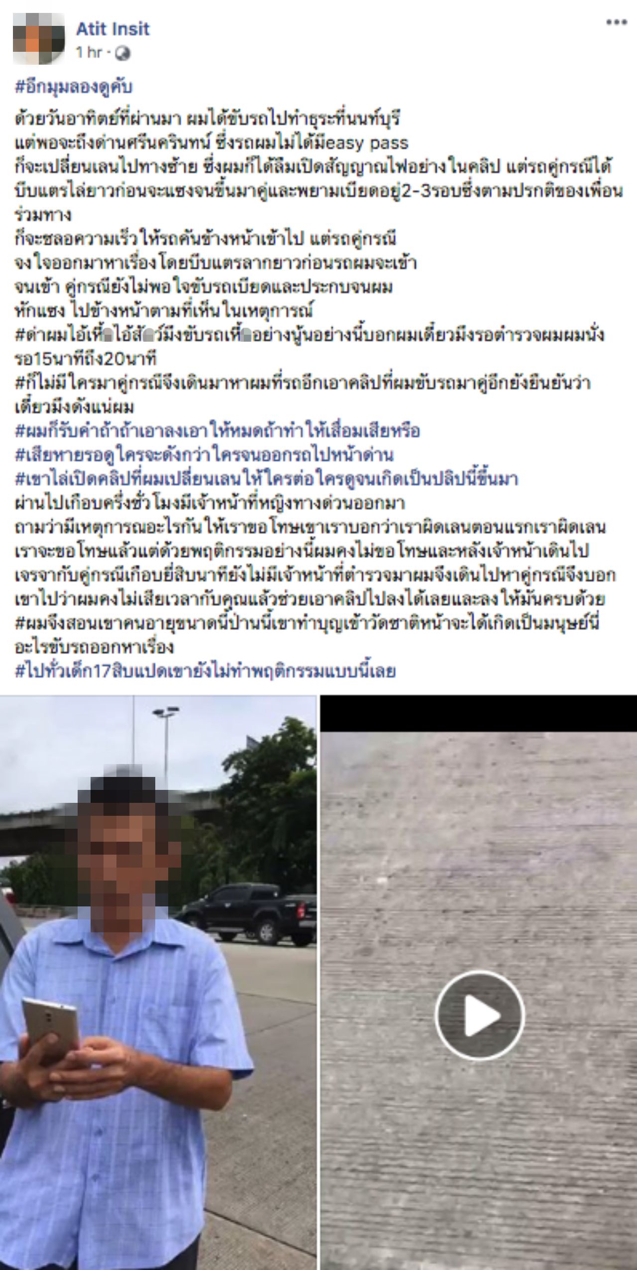 ด่าผมไอ้เหี้_ไอ้สั_ว์ มึงขับรถเหี้_อย่างนู้นอย่างนี้ บอกผมเดี๋ยวมึงรอตำรวจ ผมนั่งรอ 15-20 นาที ก็ไม่มีใครมา คู่กรณีจึงเดินมาหาผมที่รถอีก เอาคลิปที่ผมขับรถมาขู่อีก ยังยืนยันว่าเดี๋ยวมึงดังแน่ ผมก็รับคำท้า ถ้าเอาลงเอาให้หมด ถ้าทำให้เสื่อมเสียหรือเสียหาย รอดูใครจะดังกว่าใคร จนออกรถไปหน้าด่าน เขาไล่เปิดคลิปที่ผมเปลี่ยนเลนให้ใครต่อใครดูจนเกิดเป็นคลิปนี้ขึ้นมา ผ่านไปเกือบครึ่งชั่วโมง มีเจ้าหน้าที่หญิงทางด่วนออกมาถามว่ามีเหตุการณ์อะไรกัน ให้เราขอโทษเขา เราบอกว่าเราผิดเลน ตอนแรกเราผิดเลน เราจะขอโทษแล้ว แต่ด้วยพฤติกรรมอย่างนี้ผมคงไม่ขอโทษ และหลังเจ้าหน้าที่เดินไปเจรจากับคู่กรณีเกือบ 20 นาที ยังไม่มีเจ้าหน้าที่ตำรวจมา ผมจึงเดินไปหาคู่กรณี จึงบอกเขาไปว่าผมคงไม่เสียเวลากับคุณแล้ว ช่วยเอาคลิปไปลงได้เลย และลงให้มันครบด้วย ผมจึงสอนเขาคนอายุขนาดนี้ป่านนี้เขาทำบุญเข้าวัด ชาติหน้าจะได้เกิดเป็นมนุษย์ นี่อะไรขับรถออกหาเรื่องไปทั่ว เด็ก 17-18 เขายังไม่ทำพฤติกรรมแบบนี้เลย”