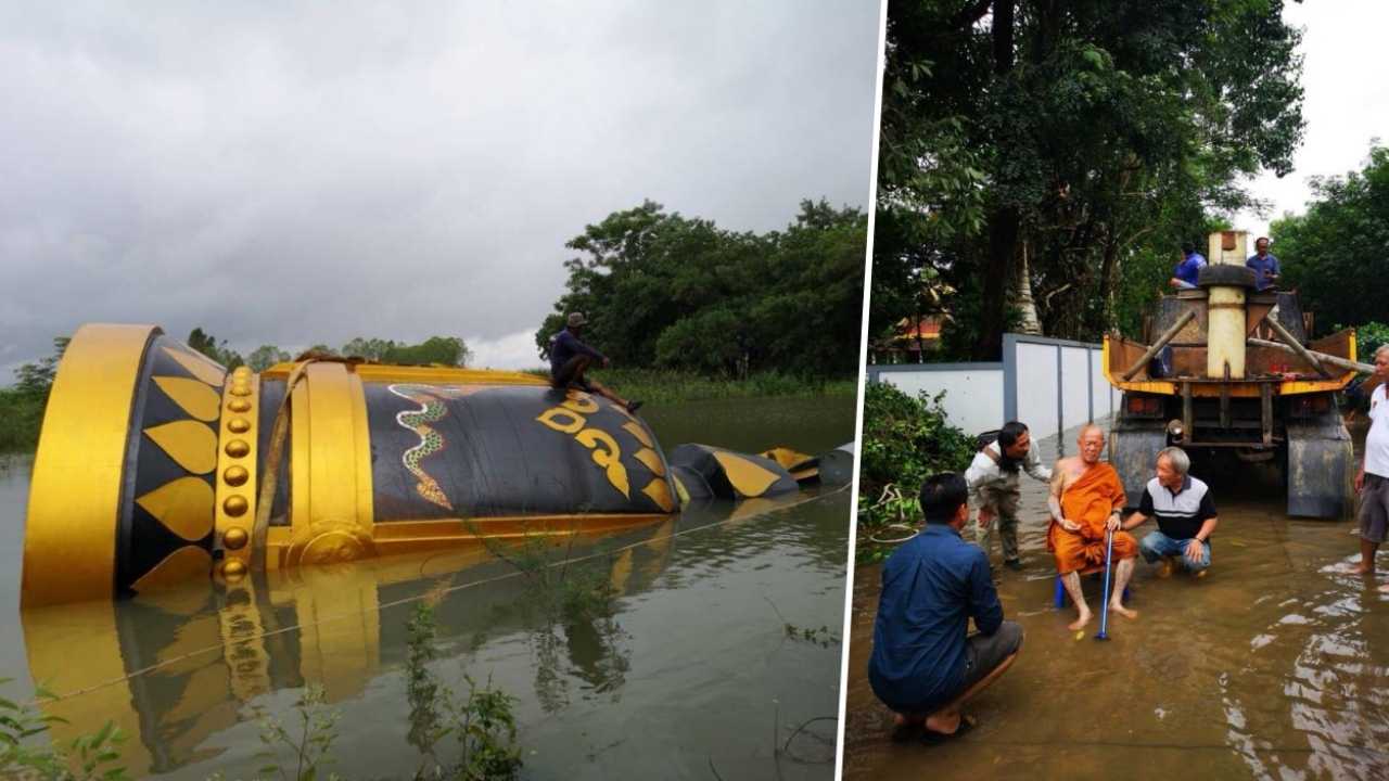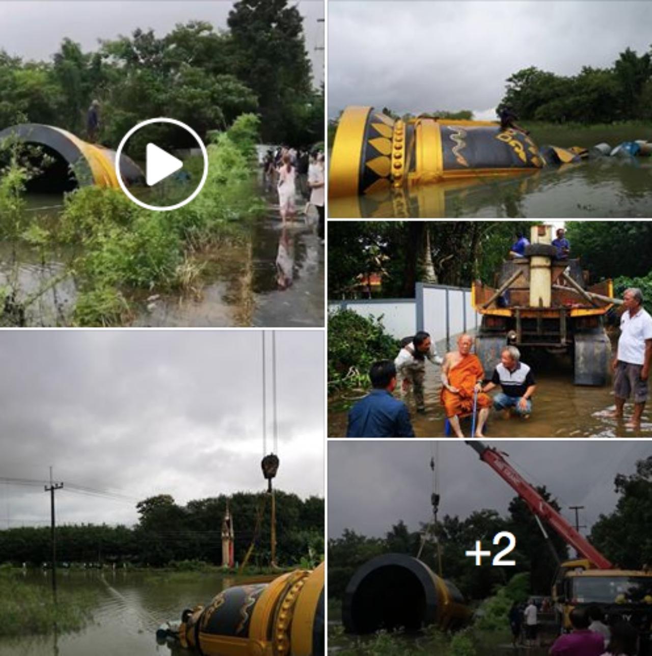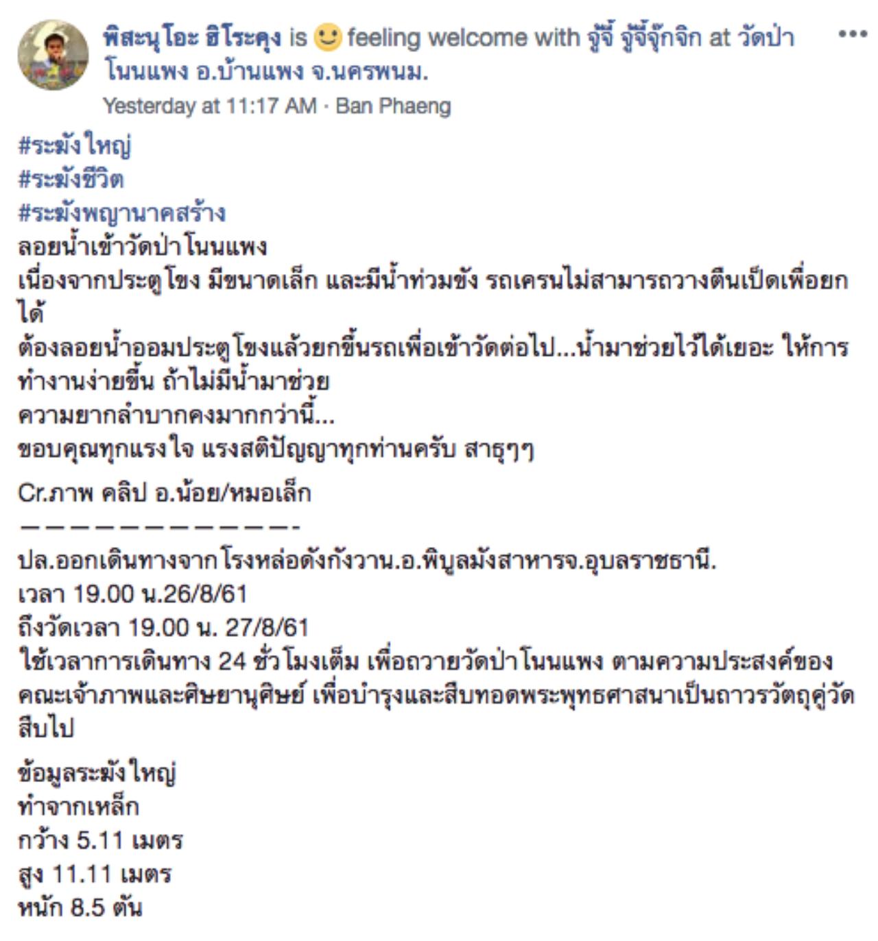เฟซบุ๊ก พิสะนุโอะ ฮิโระคุง ได้โพสต์คลิประฆังพญานาคสร้าง ซึ่งเป็นระฆังเหล็กขนาดใหญ่ กว้าง 5.11 เมตร สูง 11.11 เมตร หนัก 8.5 ตัน กำลังลอยน้ำเข้าวัดป่าโนนแพง อ.บ้านแพง จ.นครพนม ลงในกลุ่ม ศิษย์หลวงพ่อบุญอุ้ม อาภัสสโร โดยระบุว่า เนื่องจากประตูโขง มีขนาดเล็ก และมีน้ำท่วมขัง รถเครนไม่สามารถวางตีนเป็ดเพื่อยกได้ ต้องให้ระฆังลอยน้ำอ้อมประตูโขงแล้วยกขึ้นรถเพื่อเข้าวัดต่อไป น้ำมาช่วยไว้ได้เยอะ ให้การทำงานง่ายขึ้น ถ้าไม่มีน้ำมาช่วย ความยากลำบากคงมากกว่านี้...ขอบคุณทุกแรงใจ แรงสติปัญญาทุกท่านครับ สาธุๆๆ