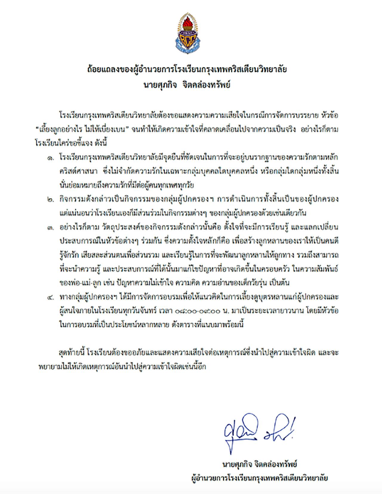 ที่เฟซบุ๊กเพจของสมาคมผู้ปกครองและครู โรงเรียนกรุงเทพคริสเตียนวิทยาลัย ได้โพสต์ข้อความและเอกสารแถลงการณ์ขออภัย และชี้แจง หลังถูกวิพากษ์วิจารณ์เกี่ยวกับการจัดบรรยาย หัวข้อ “เลี้ยงลูกอย่างไร ไม่ให้เบี่ยงเบน”