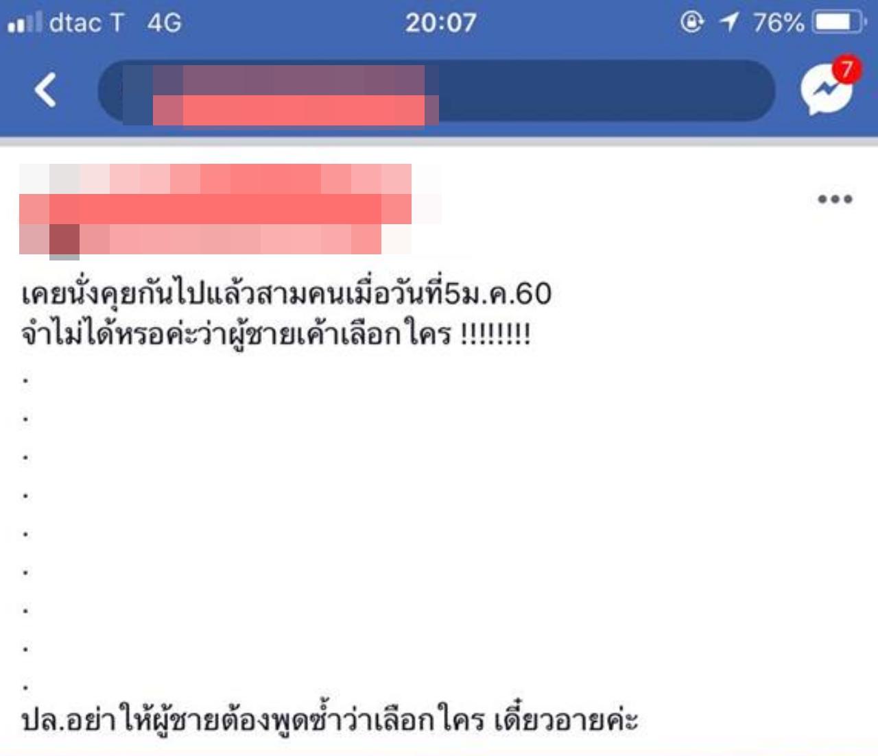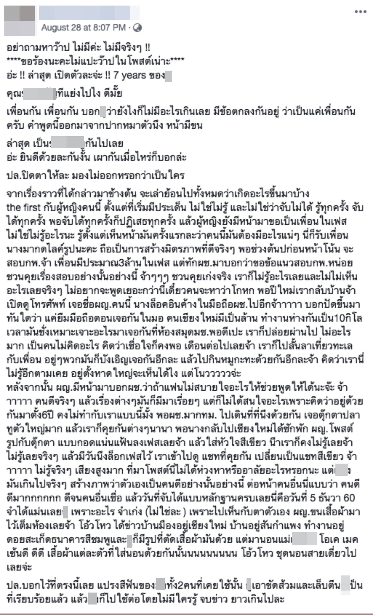 วันที่ 31 ส.ค.61 โลกออนไลน์ได้ให้ความสนใจเรื่องราวความรักของผู้ใช้เฟซบุ๊กสาวรายหนึ่ง ที่ได้เล่าว่า ได้คบกับแฟน 7 ปี แต่อยู่กันคนละที่ สุดท้ายกลับถูกผู้หญิงคนหนึ่งแย่งไป โดยในตอนแรกแฟนยืนยันว่าเป็นแค่เพื่อนกัน ไม่มีอะไรเกินเลย ซึ่งผู้หญิงคนนี้ก็ได้ทักเฟซบุ๊กมาชวนแฟนคุยเรื่องแนวข้อสอบ ก.พ. ทั้งที่เพื่อนคนอื่นในเฟซบุ๊กก็มีเยอะ ตนก็ไม่ได้ว่าอะไร จนช่วงปีใหม่ตนได้กลับบ้านและเปิดมือถือของแฟนดูปรากฏว่ามีชื่อของผู้หญิงคนนี้ล็อกอินค้างไว้ ซึ่งแฟนก็บอกปัดว่าให้ผู้หญิงคนนี้ยืมมือถือตอนบังเอิญเจอกัน ทั้งที่ทั้งคู่ทำงานห่างกันเป็น 10 กิโลเมตร แต่ด้วยความเชื่อใจก็เลยปล่อยผ่านไป